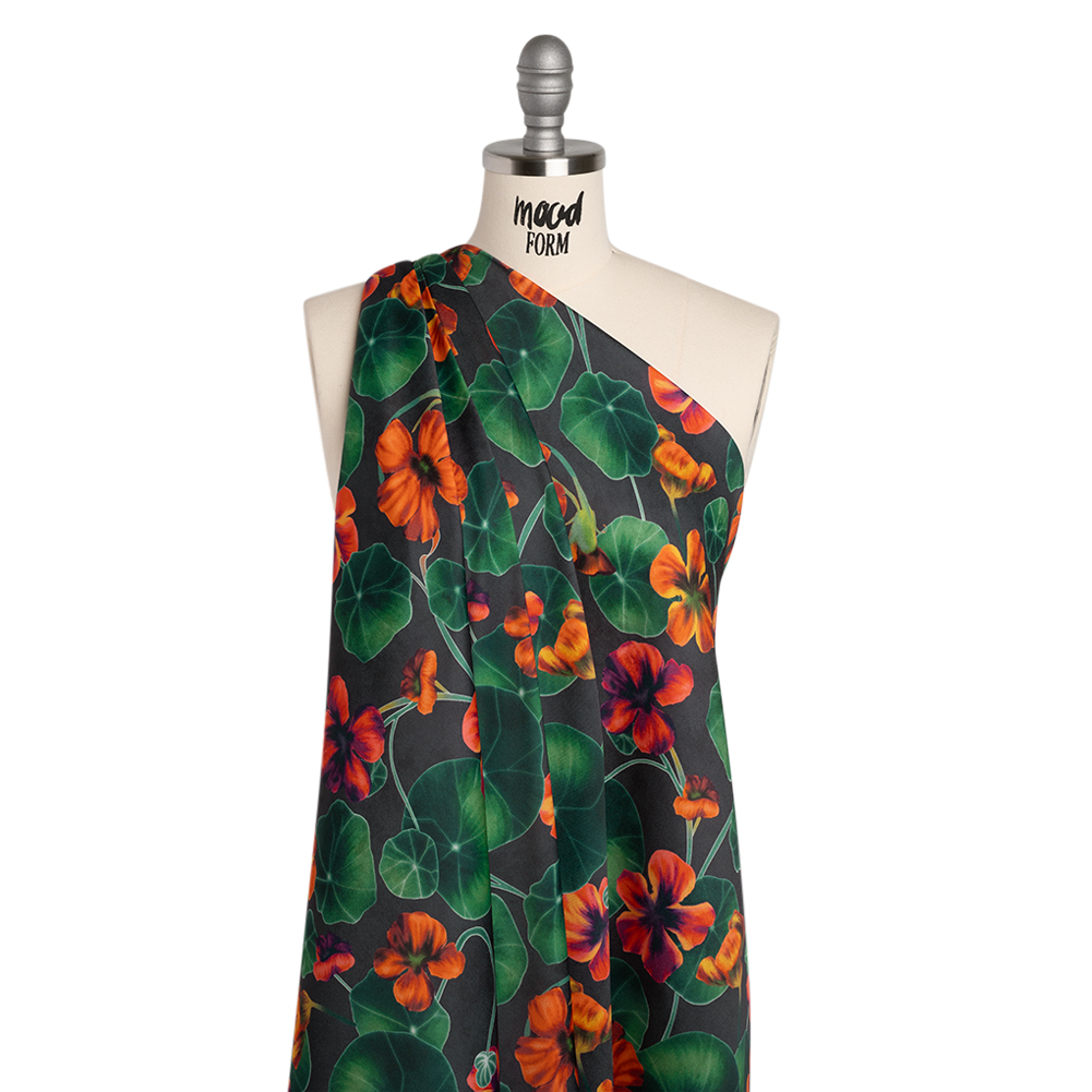 Turn your stormy mood for the better with our Mood Exclusive Climbing Crocus Polyester Crepe-Back Satin—featuring a smooth hand, slight luster, and billowing drape.Suggested Projects: Shirts, Pants, Dresses, SkirtsContent: 100% PolyesterStretch: NoneOpacity: Slightly TranslucentRich green vines twist and climb, adorned with vibrant orange and purple blooms, all against a moody storm-gray backdrop. In stark contrast with the matte, grainy reverse, the face boasts a smooth hand and slight luster. To emphasize the full-bodied drape, create billowing summer gowns and maxi skirts with the satin side, or achieve a more casual style with patterned camp shirts and wide-legged pants. Slightly translucent, we recommend adding a lining for opacity and a luxurious finish.