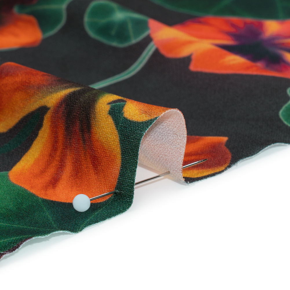 The name says "climbing crocus," which is funny because crocuses are bulb flowers, not vines. (If you garden, you know. ) But I recognized the actual flower, nasturtiums, immediately, and I bought it right away because I have had trouble finding a non-custom nasturtium print. I am mainly leaving this review so that other people who are on that very specific search can find it. I'll add that this is not a high-shine satin, although the crepe backing does look like crepe. 0% stretch.