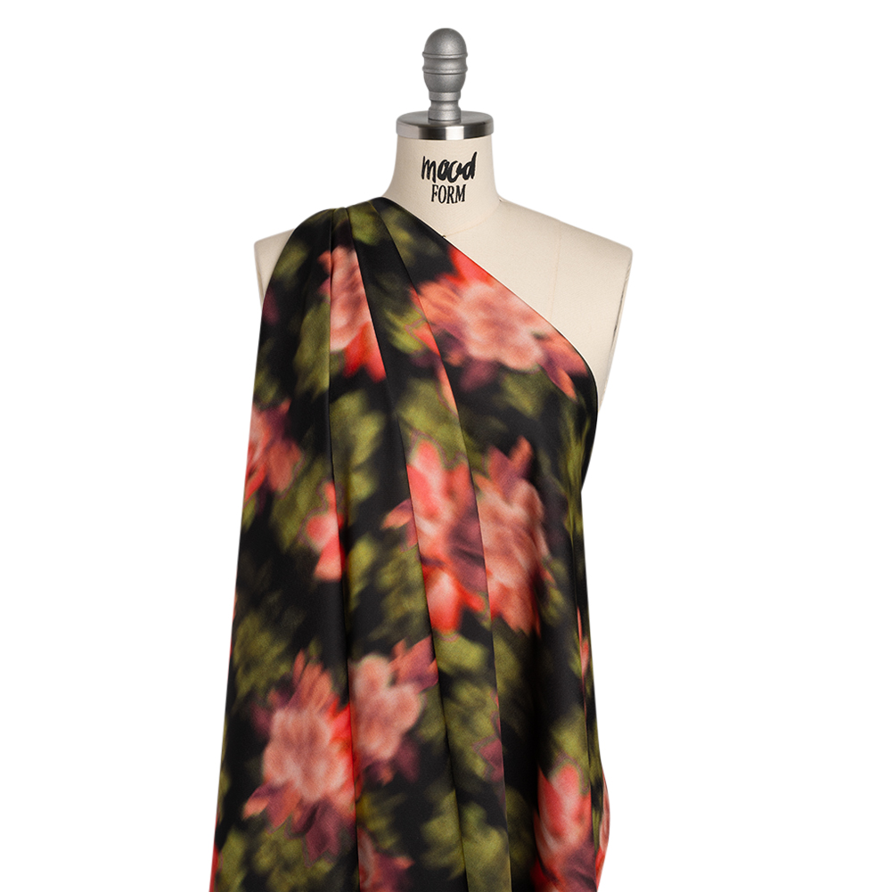 You’ll be the focus of every design in our Mood Exclusive Blurring Blossoms Polyester Crepe-Back Satin—featuring a smooth hand, slight luster, and billowing drape.Suggested Projects: Shirts, Pants, Dresses, SkirtsContent: 100% PolyesterStretch: NoneOpacity: Slightly TranslucentAchieve the perfect bokeh effect with this print, where coral and pink flowers blur softly against the impression of olive green leaves and black shadows. The vibrant blooms fade into the background, letting the wearer stand in sharp focus, radiating clarity amidst the dreamy, soft hues. In stark contrast with the matte, grainy reverse, the face boasts a smooth hand and slight luster. To emphasize the full-bodied drape, create billowing summer gowns and maxi skirts with the satin side, or achieve a more casual style with patterned camp shirts and wide-legged pants. Slightly translucent, we recommend adding a lining for opacity and a luxurious finish.