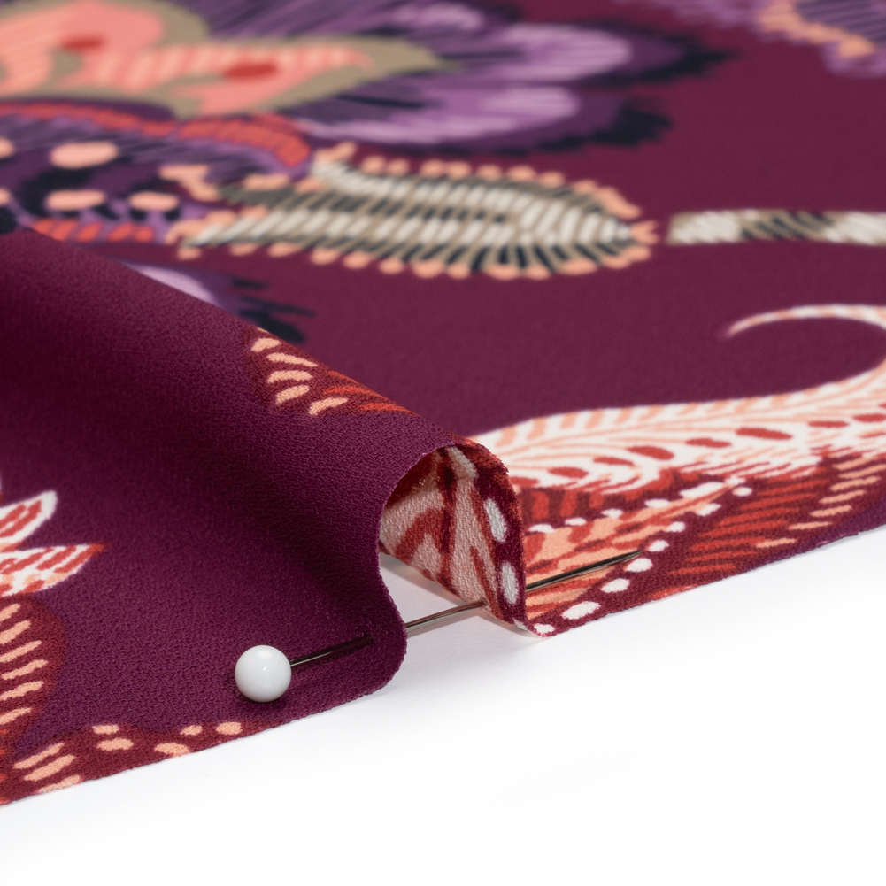 Polyester Crepe Print – Berry, Coral Pink, and Purple Jacobean Floral – Designer Deadstock