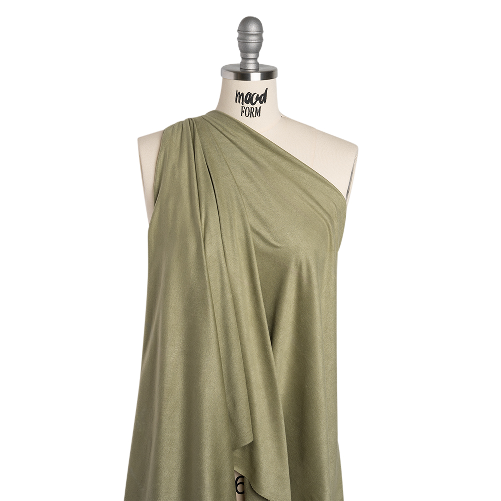 This Sage Green Polyester Faux Suede Jersey is the one faux you—featuring a soft, smooth hand and fluid drape.Suggested Projects: Dresses, Skirts, Pants, CardigansContent: PolyesterStretch: 50% Weftwise, 25% WarpwiseOpacity: OpaqueThis sage green jersey is the perfect companion to slow days spent lounging around the house. With a delightfully fluid drape and softly smooth hand—thanks to a faux suede construction—embrace a relaxing day in luxurious loungewear, take in the breeze in a scoop-neck maxi dress, or cover up as day turns to night with a chic, breezy cardigan. Opaque, a lining is not necessary for most applications.