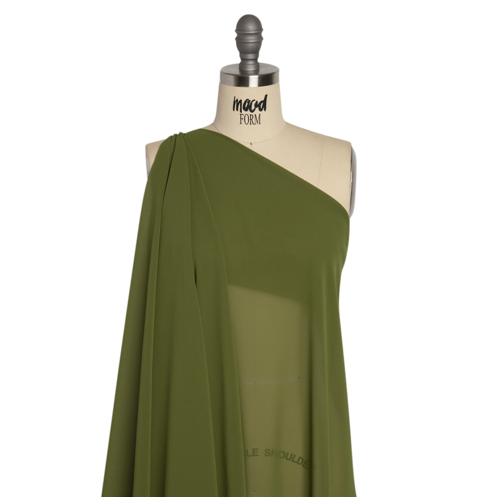 An elegant fabric at an affordable price? You get the pesto both worlds with this Pesto Polyester High-Multi Chiffon! Featuring a light, airy drape and grainy hand, it’s a sheer delight to work with!Suggested Projects: Blouses, Lingerie, Dresses, SkirtsContent: 100% PolyesterStretch: NoneOpacity: SheerDrape yourself in elegant earth tones with this pesto green chiffon. The light and airy drape brings an ethereal feel to any silhouette, seen most often as blouses, lingerie, scarves, and overlays in formal dresses and skirts. The sheer, dark green face boasts a grainy hand. With or without a lining, consider chiffon for your next in-office workday, date night, prom, or formal event!Pair premium quality with affordability in our Exclusive Basics Collections! Explore colorful polyester chiffon and more, perfect for creating special occasion looks on a budget.