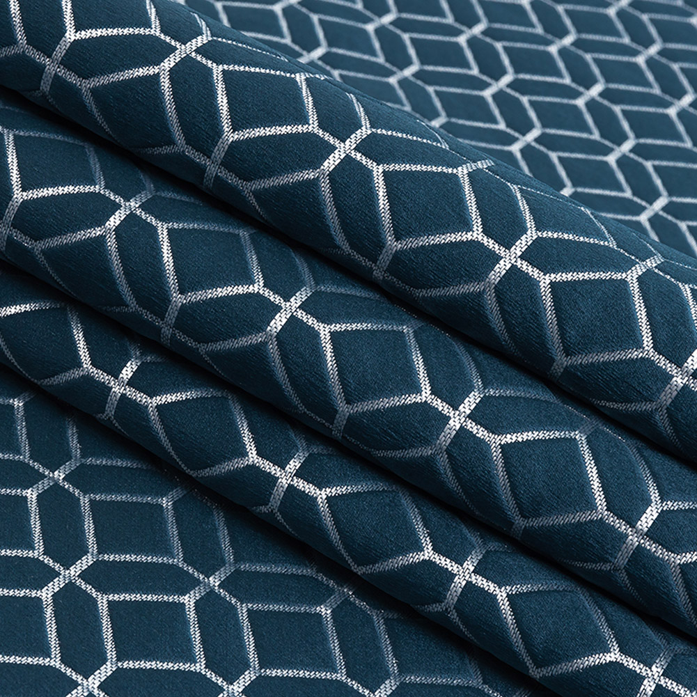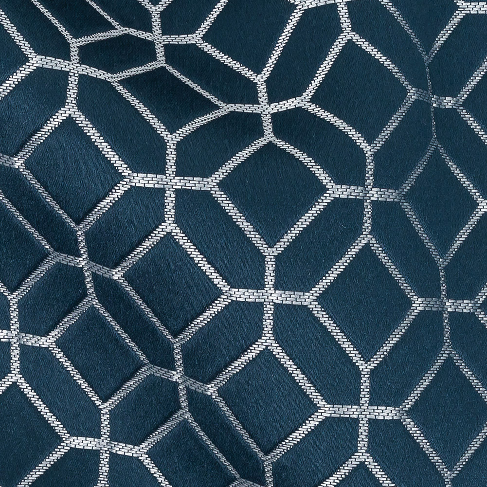 You can indi-go whatever direction you want with this British Imported Indigo Tiled Geometric Polyester Jacquard! A luminous slightly raised pattern of squares and stretched hexagons rise above shimmering metallic lines that hold them together like tile grout. Slick and textural in hand with a full, heavy drape, this fabric forms the finest window treatments you can imagine. Craft curtains that class up any room, dazzling drapes fit for royalty, and swags or valances to stun. Plus, light upholstery projects like pillows and accent ottomans will shine, too! For drapery, this fabric is mostly opaque but may benefit from a lining to achieve a full blackout effect and to protect the fibers from sun damage and fading, especially in high-sun windows.