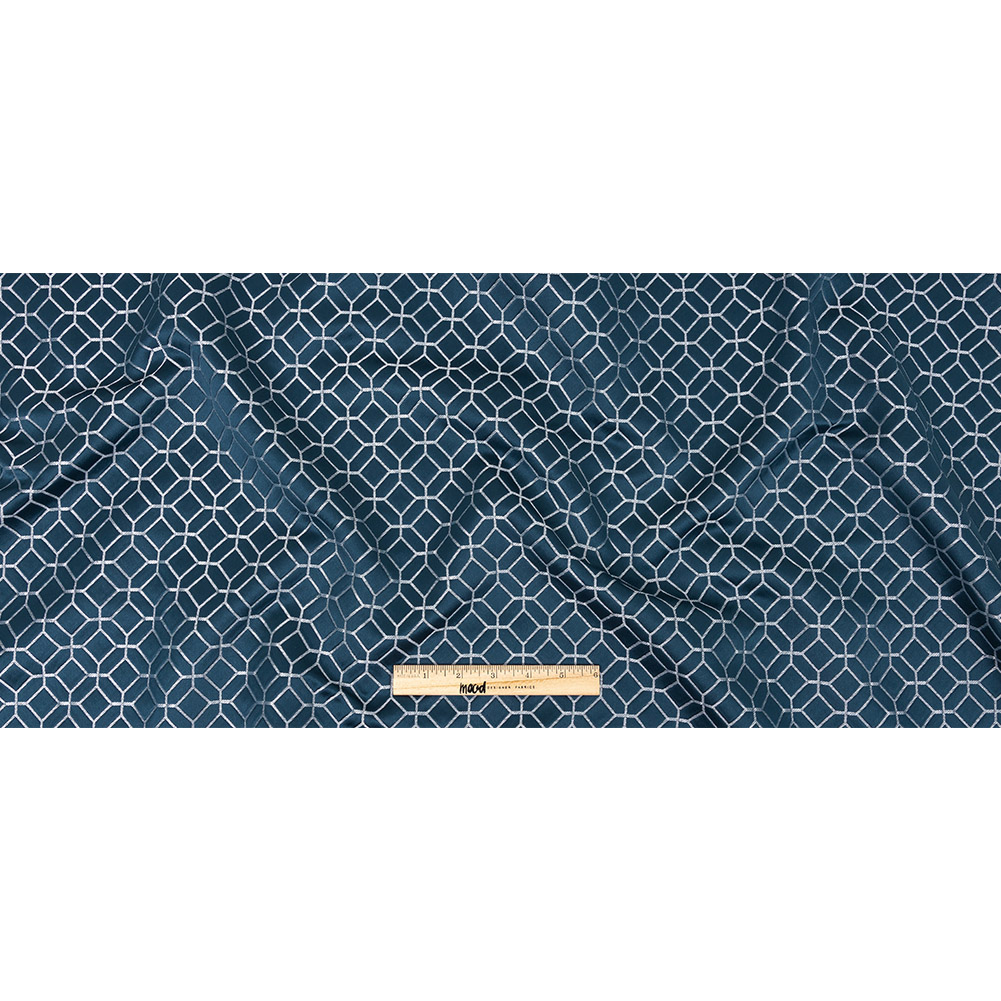 You can indi-go whatever direction you want with this British Imported Indigo Tiled Geometric Polyester Jacquard! A luminous slightly raised pattern of squares and stretched hexagons rise above shimmering metallic lines that hold them together like tile grout.