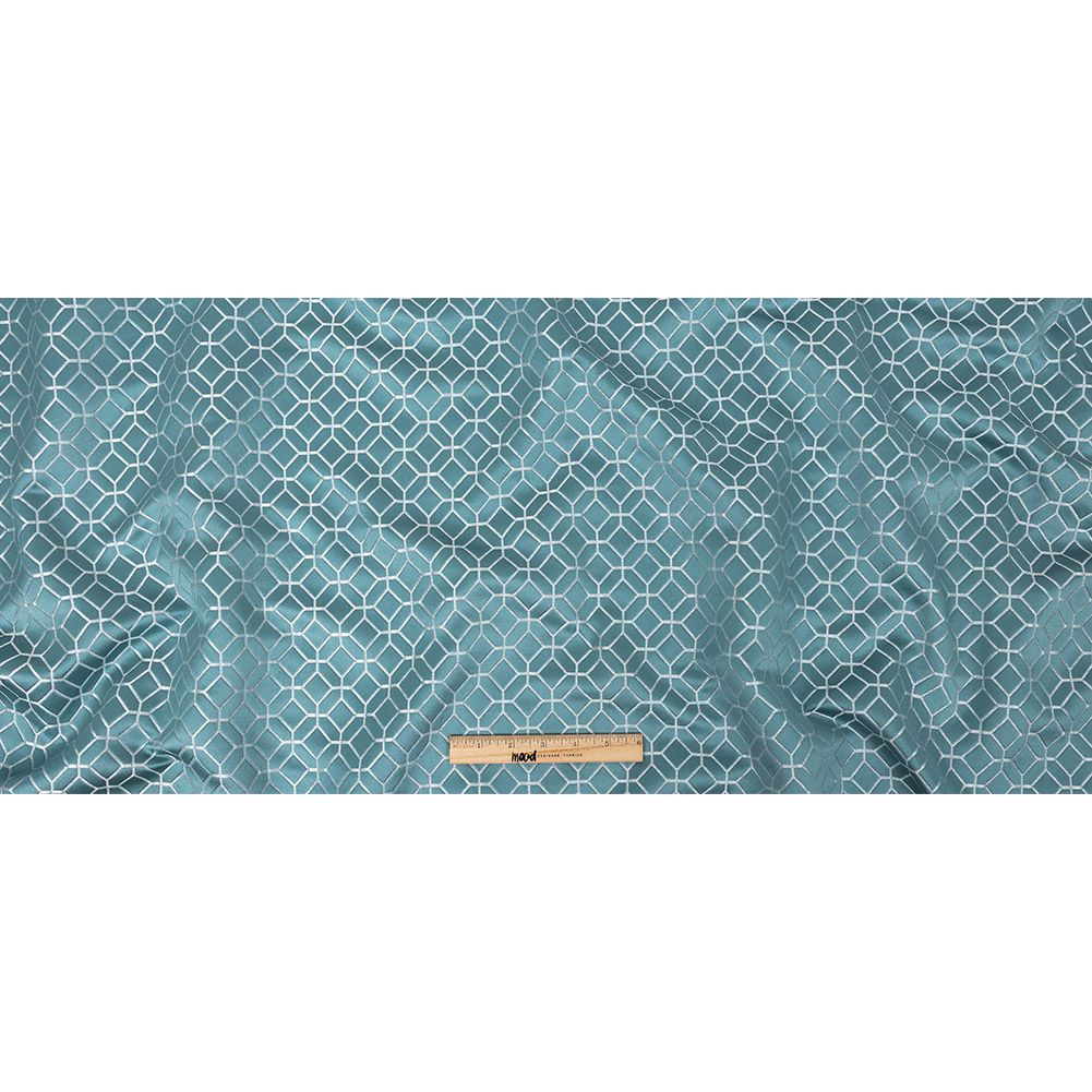 There’ll be nothing but blue skies with this British Imported Sky Tiled Geometric Polyester Jacquard! A luminous slightly raised pattern of squares and stretched hexagons rise above shimmering metallic lines that hold them together like tile grout.