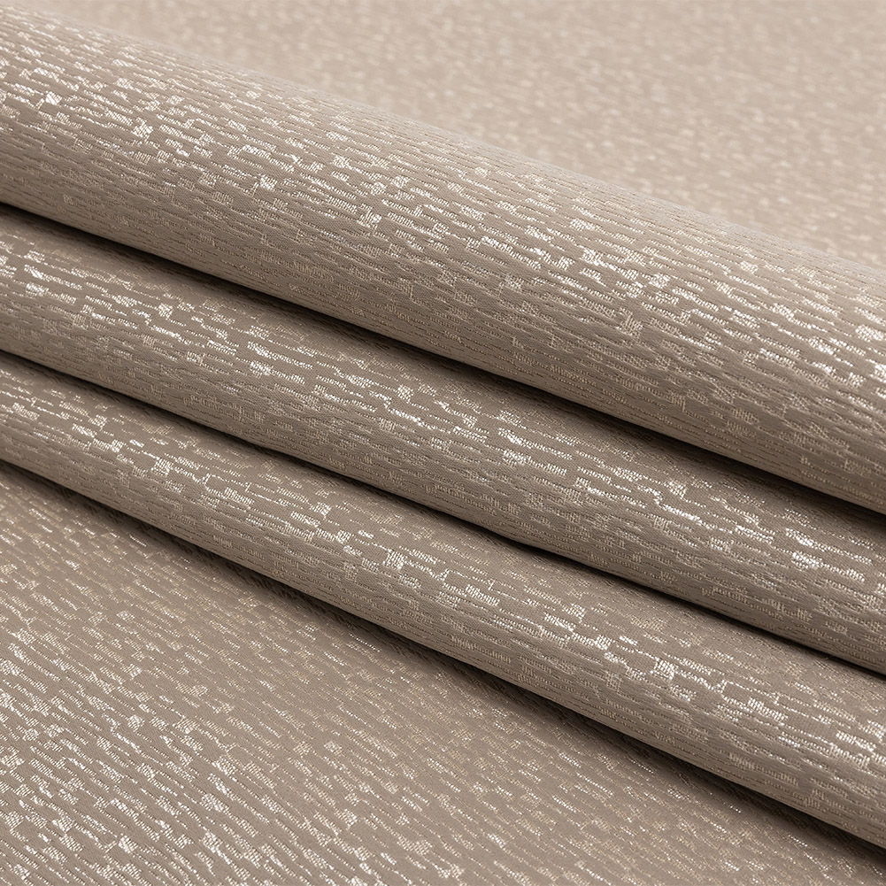 If you're looking for a mix of gold and brown, this British Imported Taupe Striated Polyester Jacquard is your new best friend. With a smooth, soft hand and a full, elegantly voluminous drape, this light gold drapery with brown undertones and a striated surface will subtly reflect the light, illuminating any room in your living space. Use this woven to style curtains, decorative throw pillows, or shimmering bed skirts. Lightweight and opaque, this material is excellent at blocking light on its own, however, adding a drapery lining can only help; plus, it will protect the fibers from sun damage and fading.