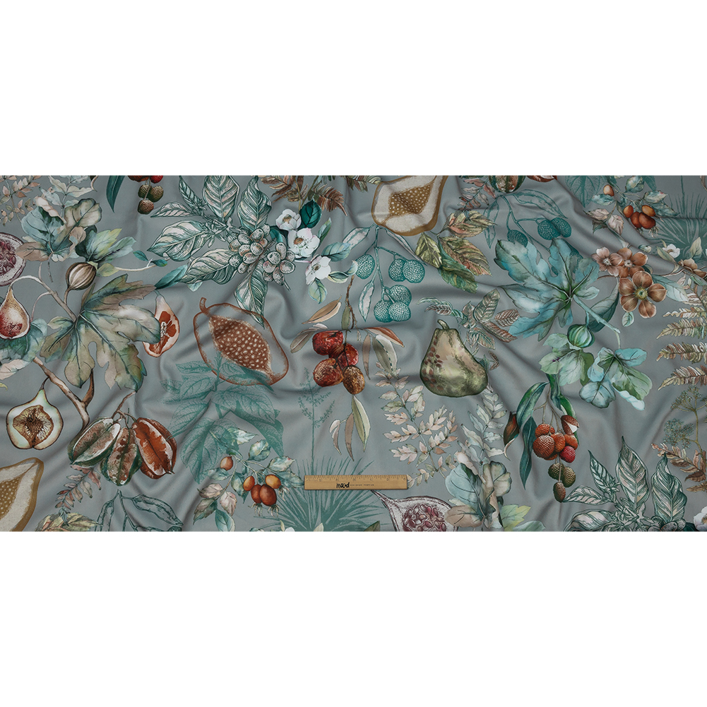 Skip stones, but don't skip over this beautiful British Imported Stone Tropical Fruits and Foliage Printed Polyester Microvelvet! The cool gray background is adorned with copious amounts of fruits including pears, lychees, and papayas, as well as elegant foliage. Buttery smooth and soft along the face with a fuzzy plain white background, it features a flexible drape and no stretch. Design pleated curtains, drapes with simple ties, and short valances with embroidered trim, or fashion light upholstery projects like pillows, window seat covers, ottomans, floor pillows, and more. Opaque on its own, a lining can be used for sun protection in drapery projects if desired.Please note: Although the overall width of this fabric is 55", the usable printed area is only 51" wide.