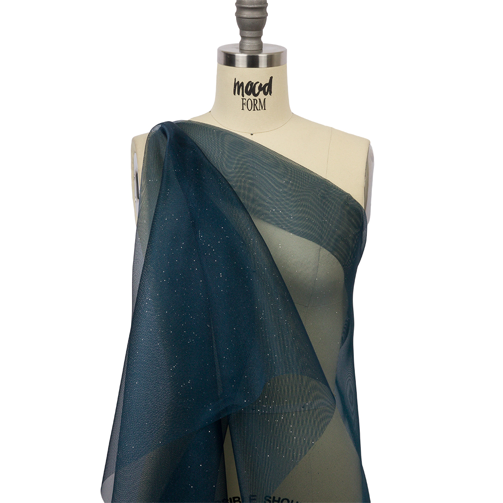 Be the star you know you are with this Starlight Navy Polyester Mesh Organza with Silver Glitter! Silver glitter shines from the luminous surface of an organza with a slightly open weave, giving it a mesh-like quality. In addition to a crisp, almost grainy hand, it features a full, voluminous drape perfect for sculptural elements. Create evening gowns, mermaid-style prom dresses, tutus, and small gift bags. As this material is translucent, a lining may be added for additional opacity where desired.