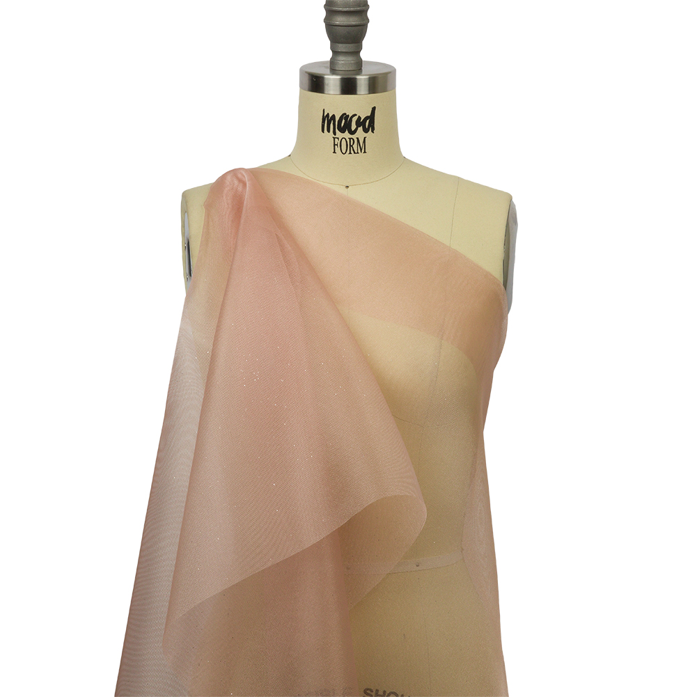 Let the world be a little more rosey and golden with this Starlight Rose Gold Polyester Mesh Organza with Silver Glitter. Silver glitter shines from the luminous surface of an organza with a slightly open weave, giving it a mesh-like quality. In addition to a crisp, almost grainy hand, it features a full, voluminous drape perfect for sculptural elements. Create evening gowns, mermaid-style prom dresses, tutus, and small gift bags. As this material is translucent, a lining may be added for additional opacity where desired.