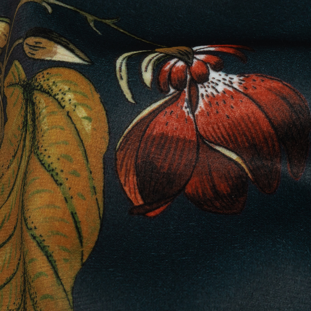 Sometimes the most beautiful things are found in the dark. Take this British Imported Ink Cockatoo Printed Polyester Microvelvet for example. With a soft sheen, an inky blue-black ground plays host to succulent fruits, lush leaves, and brightly colored cockatoos. Velvety to the touch with a fuzzy plain white reverse, it features a malleable drape and no stretch. Design full-length curtains and long valances with eye-catching embroidered trim, or fashion light upholstery projects like headboards with studs, pillows, window seat covers, and more. Opaque on its own, a lining can be used for sun protection in drapery projects if desired.Please note: Although the overall width of this fabric is 55", the usable printed area is only 52" wide.