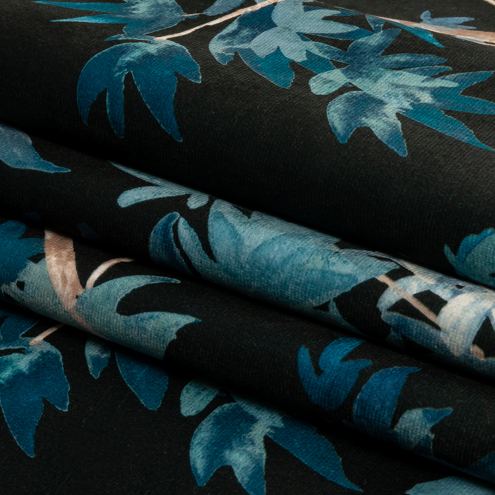 What’s better than curling up to this British Imported Midnight Watercolor Tropical Branches Printed Polyester Microvelvet on a cold fall evening? Watercolor-textured leaves in shades of blue spread along beige branches over a midnight black ground, all while providing a subtle sheen.