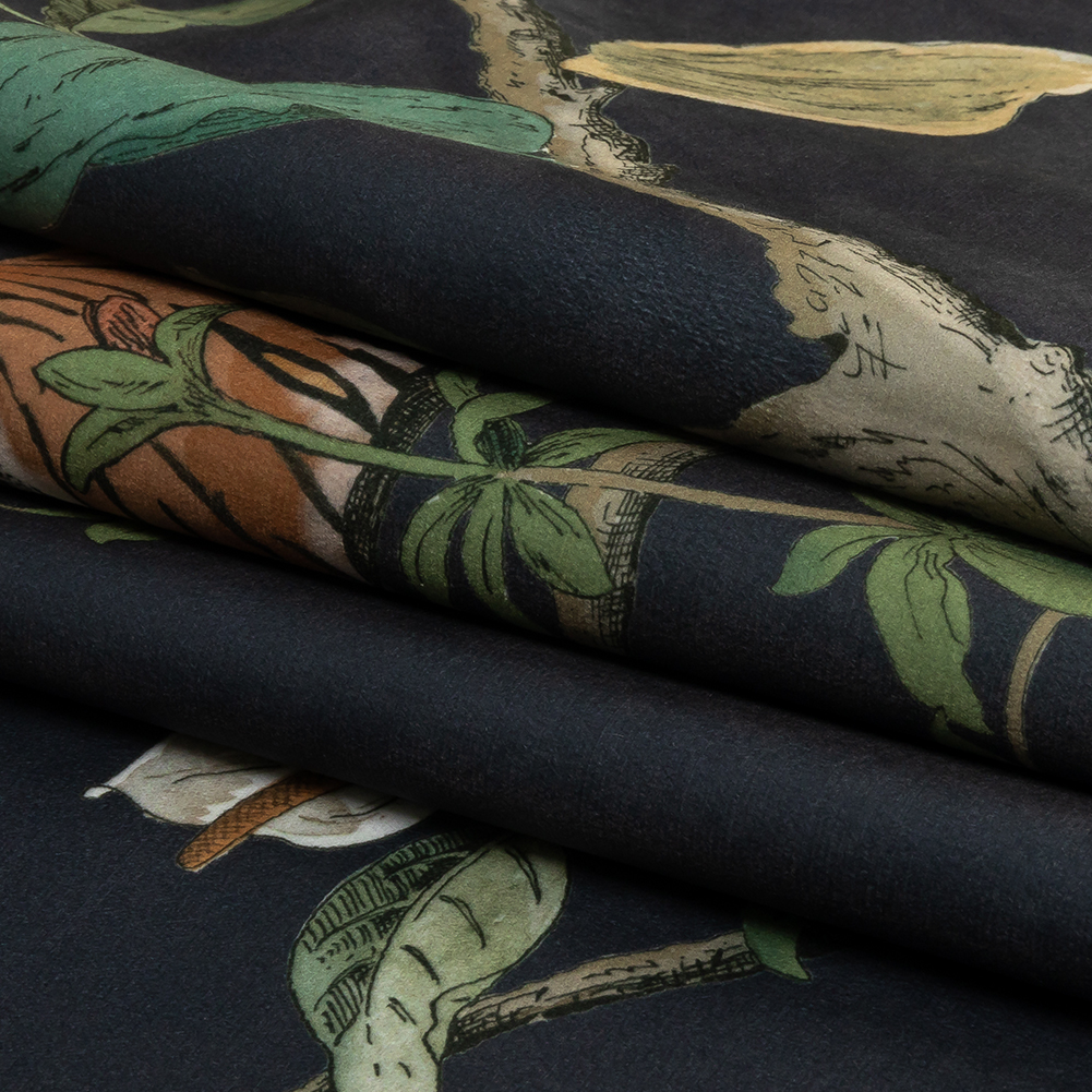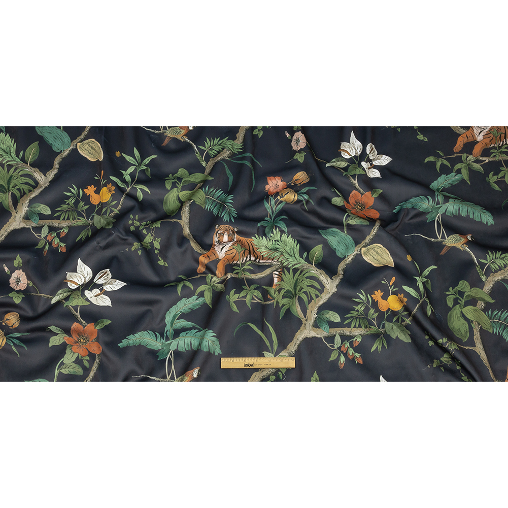 The jungle is closer than you think with this British Imported Slate Lounging Tigers Printed Polyester Microvelvet! Orange tigers lounge amidst lush foliage atop a dark gray-black ground, all illuminated by a subtle sheen. Buttery smooth and soft along the face with a fuzzy plain white backing, this material features a flexible drape and no stretch. Design full-length curtains, drapes with simple ties, and long valances with embroidered trim, or fashion light upholstery projects like pillows, window seat cushions, ottomans, floor pillows, and more. Opaque on its own, a lining can be used for sun protection in drapery projects if desired.Please note: Although the overall width of this fabric is 55", the usable printed area is only 52" wide.
