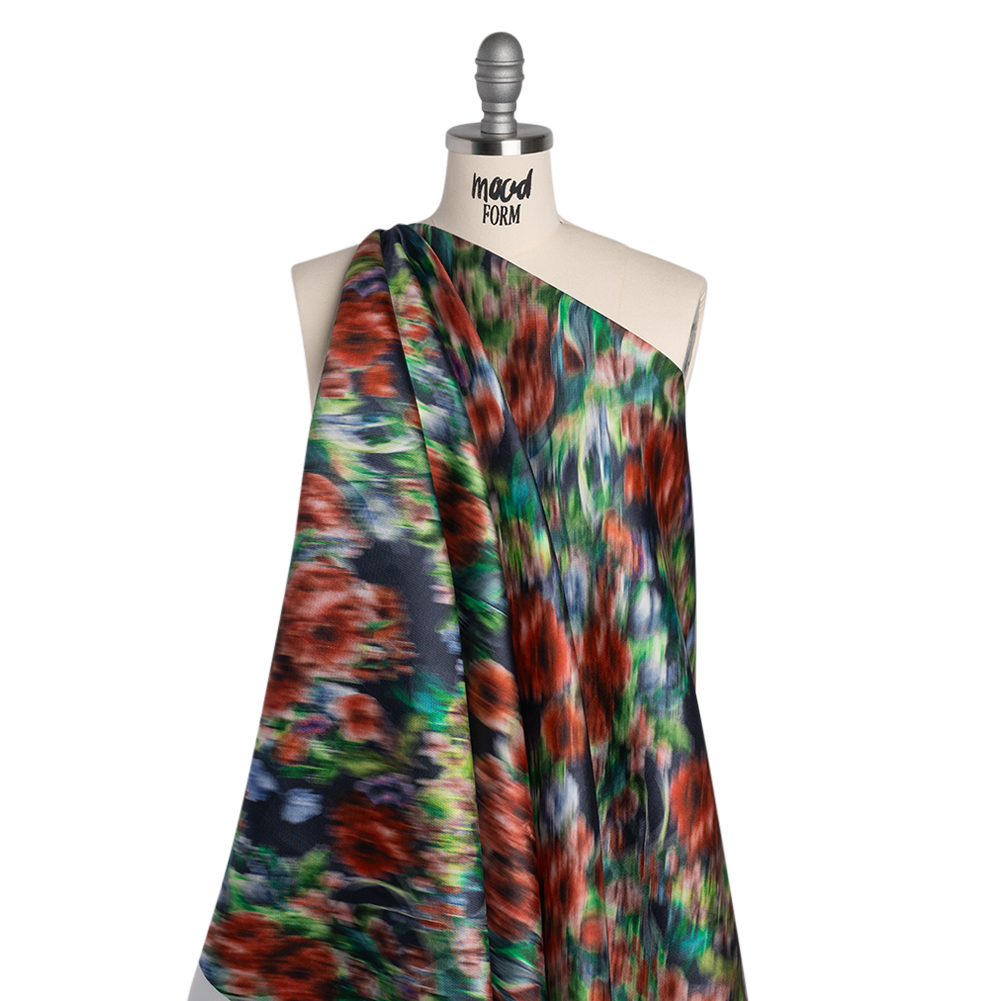 This Mood Exclusive Flickering Field Polyester Mikado invites you to take a road trip through your creativity—featuring a sleek, tactile hand and voluminous drape.Suggested Projects: Gowns, Blazers, Trousers, JumpsuitsContent: 100% PolyesterStretch: NoneOpacity: Mostly OpaqueAs you drive, the countryside stretches past in a blur—flashes of red, green, and blue blooms rushing by like a living painting. Designed for a life on the go, these florals move with you, a reminder that even in motion, there’s beauty in pausing to breathe and reconnect with nature. With its sleek, slightly tactile hand and luminous shine, this fabric radiates an air of refined elegance. Pliable yet voluminous in drape, it lends itself beautifully to structured evening gowns, blazers, trousers, or jumpsuits. While mostly opaque, a lining can be added for extra structure and a polished, flawless finish when desired.