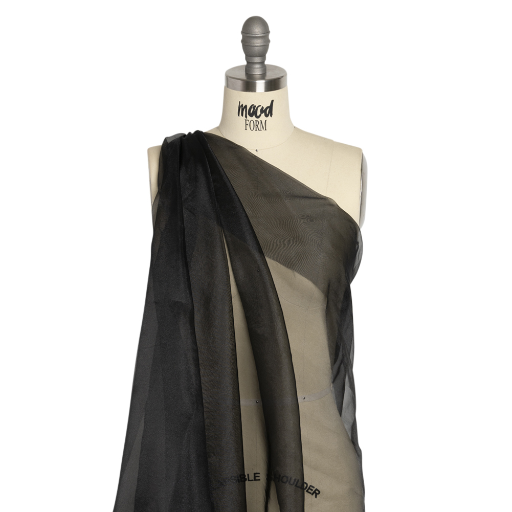 Keep it classy with this Black Polyester Organza. Ideal for inserts and overlays, it has a grainy hand, crisp drape, and sheer nature.Suggested Projects: Dresses, Skirts, Evening WearContent: 100% PolyesterStretch: NoneOpacity: SheerTimeless and trendy, this black organza is the way to go. The black face has a stunning luster and a grainy hand. Used as a sheer insert or an overlay, the crisp drape adds volume to dresses and skirts. For the fashion designer and home sewist alike, this affordably elegant fabric produces high-quality garments for formal events, weddings, costume parties, and more! Depending on the application, a lining may be desired.Pair premium quality with affordability in our Exclusive Basics Collections! Explore colorful polyester organza and more, perfect for creating special occasion looks on a budget.