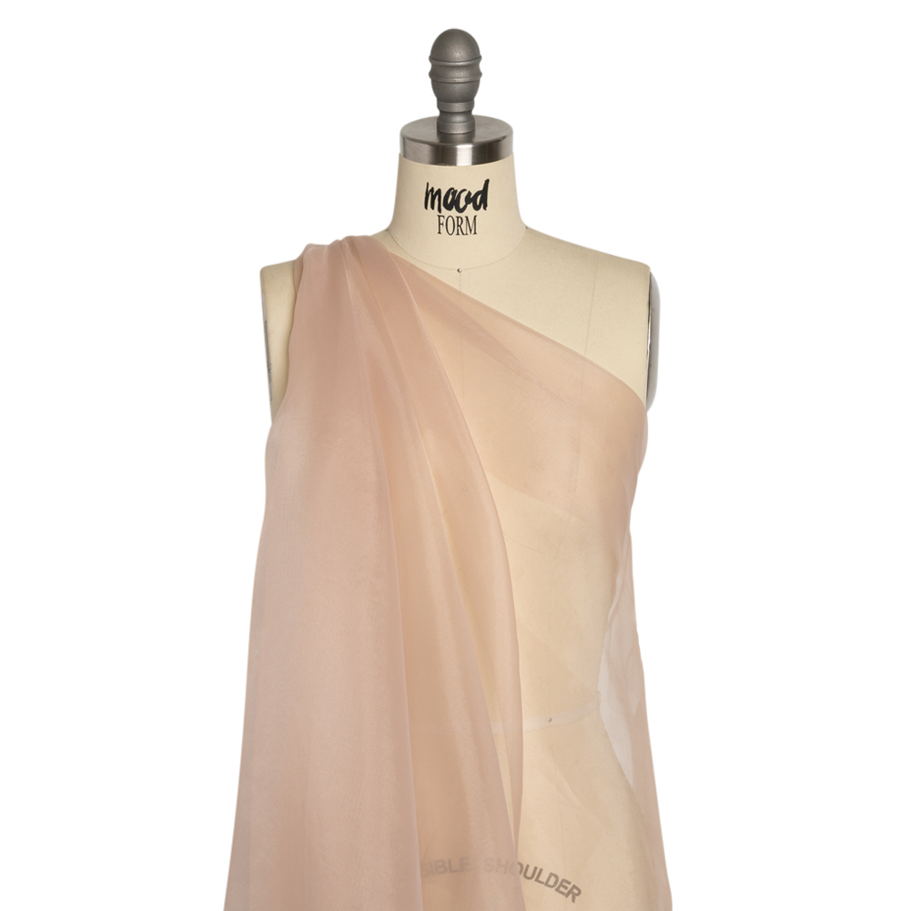 We have a blush on this Blush Polyester Organza! Ideal for inserts and overlays, it has a grainy grainy hand, crisp drape, and sheer nature.Suggested Projects: Dresses, Skirts, Evening WearContent: 100% PolyesterStretch: NoneOpacity: SheerJust as a blush gently glides across your face, this organza drapes like an airy dream across your projects. The dusty pink face has a stunning luster and a grainy hand. Used as a sheer insert or an overlay, the crisp drape adds volume to dresses and skirts. For the fashion designer and home sewist alike, this affordably elegant fabric produces high-quality garments for formal events, weddings, costume parties, and more! Depending on the application, a lining may be desired.Pair premium quality with affordability in our Exclusive Basics Collections! Explore colorful polyester organza and more, perfect for creating special occasion looks on a budget.