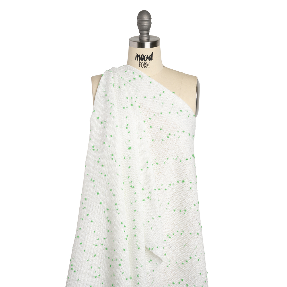 Polyester Pom Pom Tweed with Baby Sequins – White and Kelly Green – Deadstock