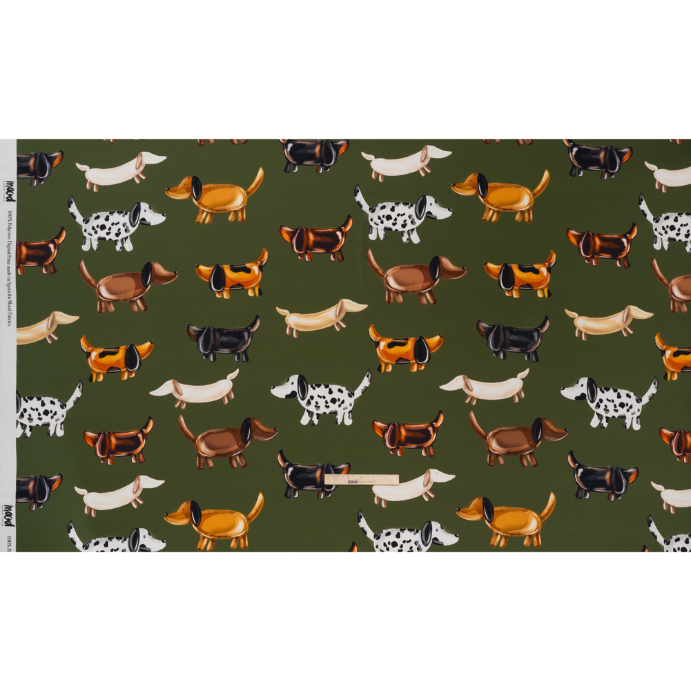 Polyester Satin - Brown, White and Olive Green Puppy Balloons - Mood Exclusive Dachshund Drift Print