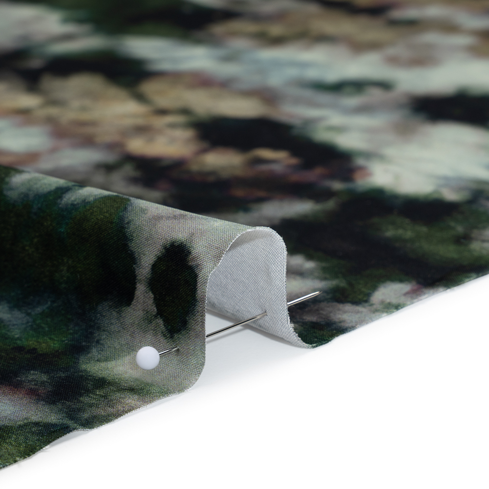 Let the colors of nature inspire you with our Mood Exclusive Earthtone Flow Polyester Satin—its smooth satin finish and flowing drape make it ideal for elegant dresses, blouses, and linings. Suggested Projects: Dresses, Skirts, Blouses, Linings Content: 100&#37 Polyester Stretch: NoneOpacity: Slightly Translucent This fabric features an abstract watercolor design with splotches of forest green, beige, and muted pale blue, blending softly across the surface for a painterly effect. The gentle mixing of colors creates a calm, organic aesthetic reminiscent of nature’s subtle palettes. It's polyester satin weave provides a smooth hand with a graceful, fluid movement that drapes beautifully on the body. Slight translucency adds a delicate layering option, making this fabric a versatile choice for sophisticated, wearable art in your wardrobe.