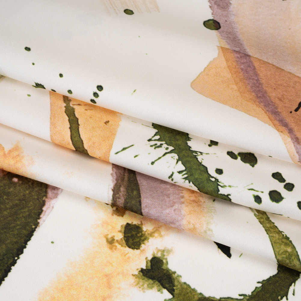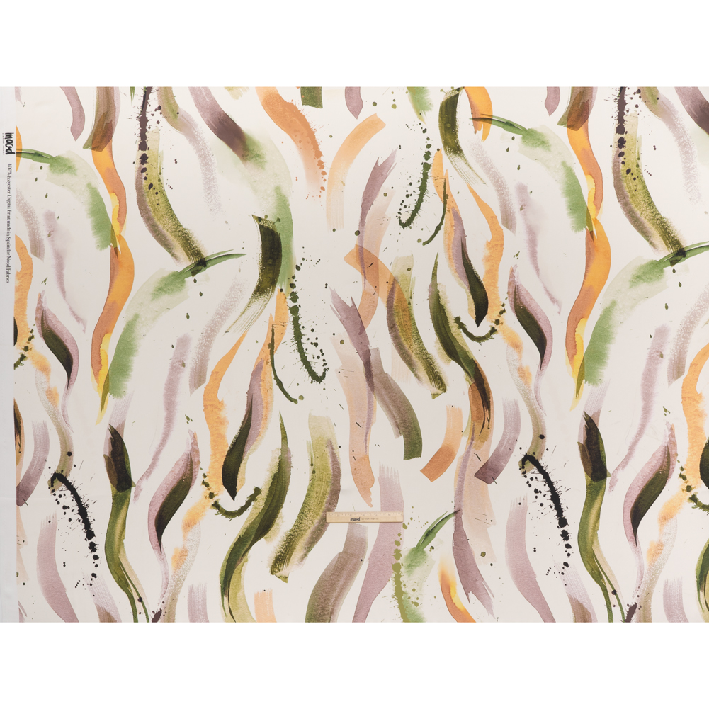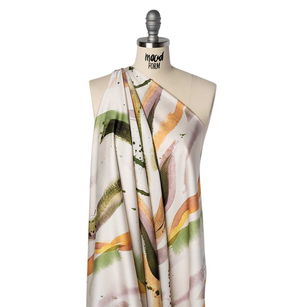 Brush up your style with the Mood Exclusive Fluid Strokes Polyester Satin—a flowing option for sleek skirts and polished blouses.Suggested Projects: Dresses, Skirts, Blouses, LiningsContent: 100% PolyesterStretch: NoneOpacity: Slightly Translucent Painterly strokes in forest green, plum purple, and vibrant tangerine sweep across a clean white ground like a modern watercolor in motion. The fluid, expressive print brings an artistic touch to any look, whether used for statement pieces or subtle accents. Crafted from polyester satin, the fabric features a smooth surface, soft luster, and graceful drape. Slightly translucent, it works beautifully for layered garments or lined pieces that showcase its airy quality.