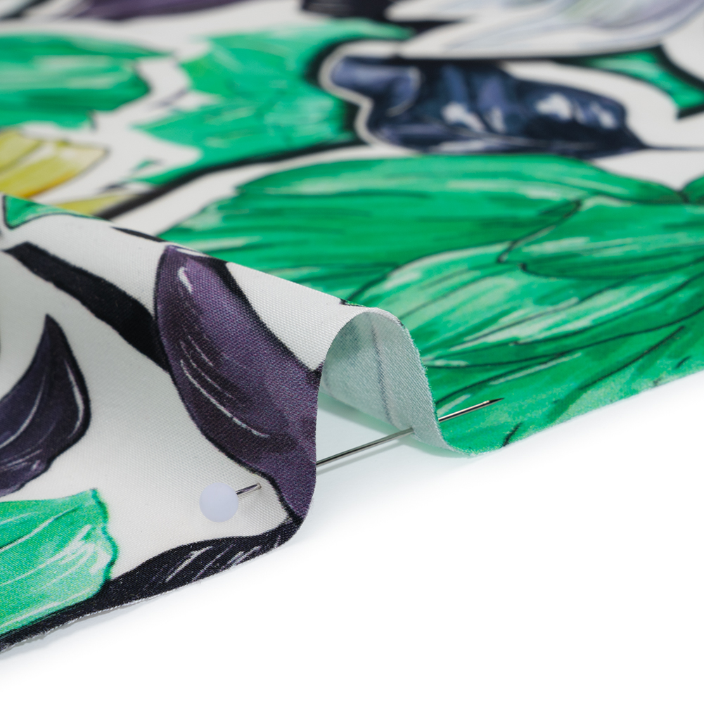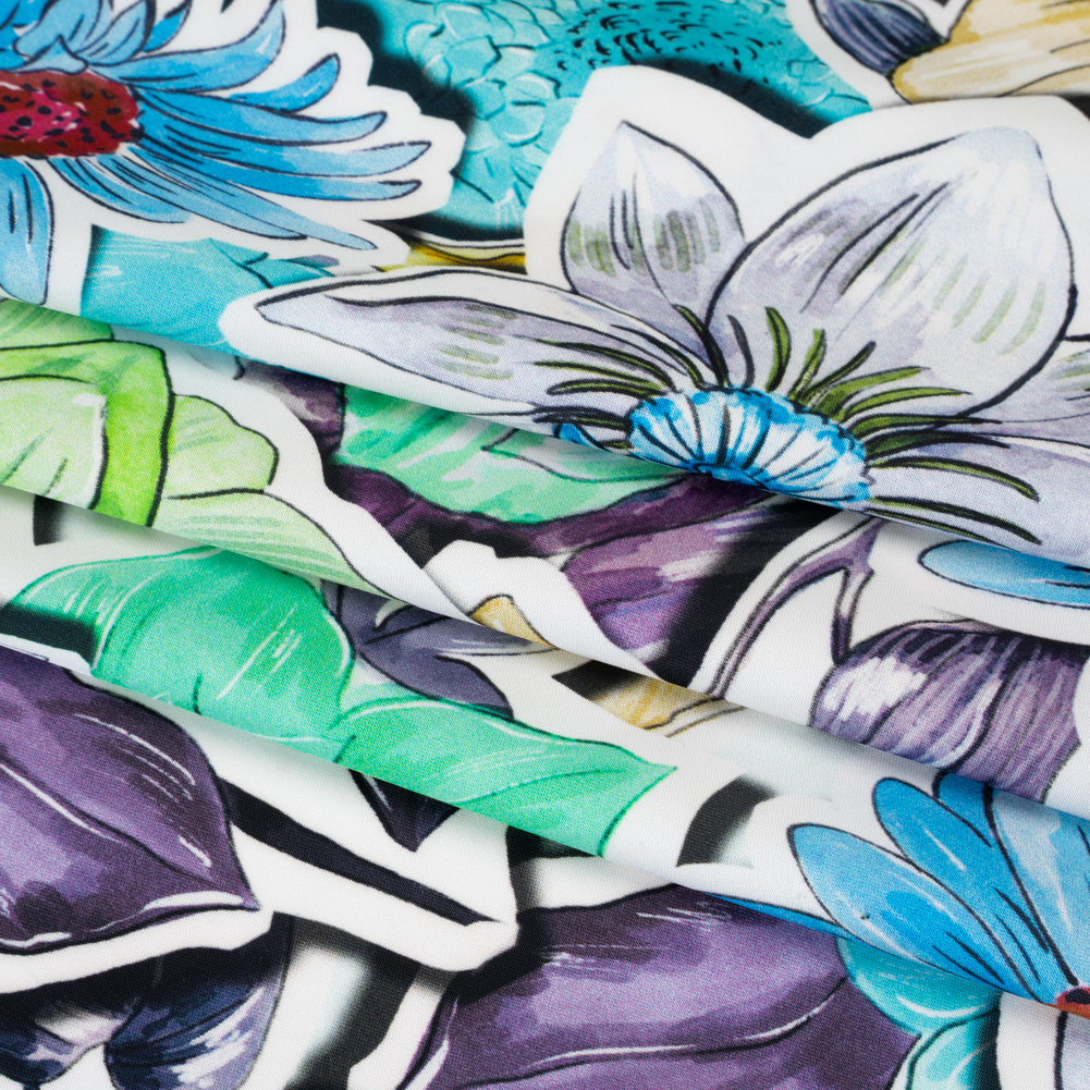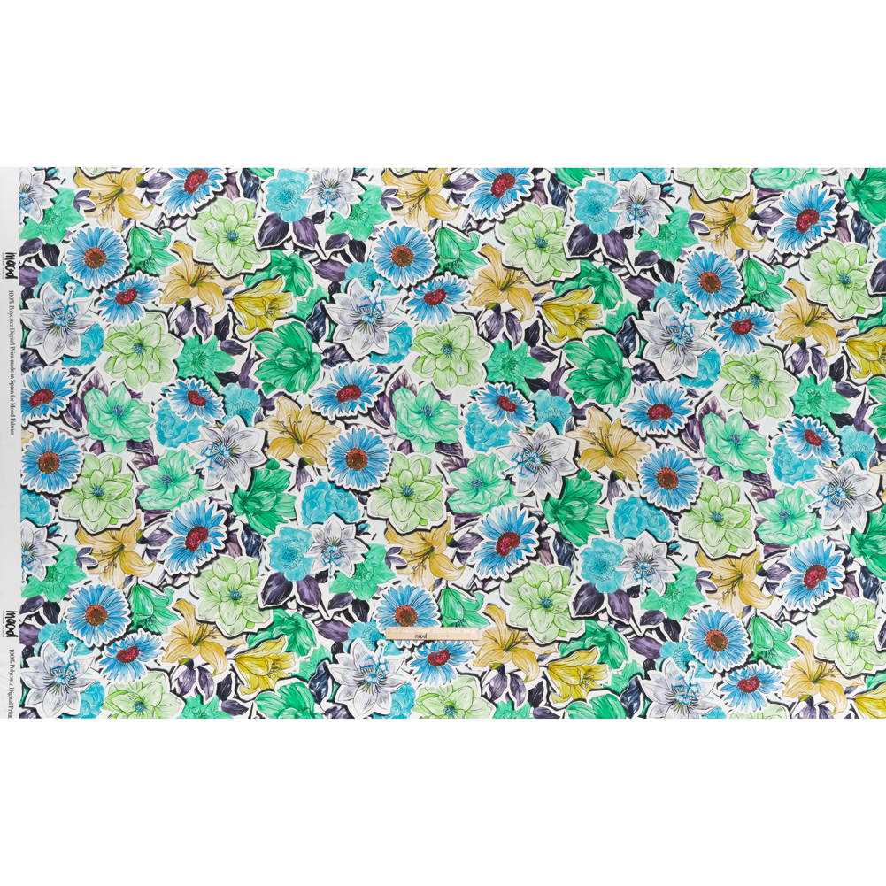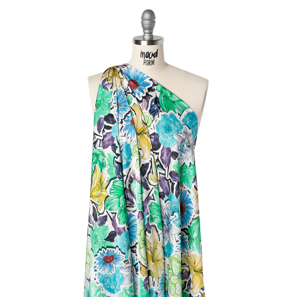 Let your creativity overlap and bloom with our Mood Exclusive Layered Whimsy Polyester Satin–perfect for flowy dresses and playful blouses. Suggested Projects: Dresses, Skirts, Blouses, Linings Content: 100% Polyester Stretch: NoneOpacity: Slightly Translucent A vivid collage of chartreuse green, cobalt blue, amethyst, and goldenrod florals fill a light background, each bloom outlined in white for a bold, graphic finish. The overlapping petals create visual depth, giving the impression of a scattered, blooming bouquet in motion. Smooth and slightly translucent with a cool touch, the fabric drapes with fluid ease while offering enough body for tailored or relaxed silhouettes alike. Ideal for unlined summer pieces or fully finished garments with a pop of personality.