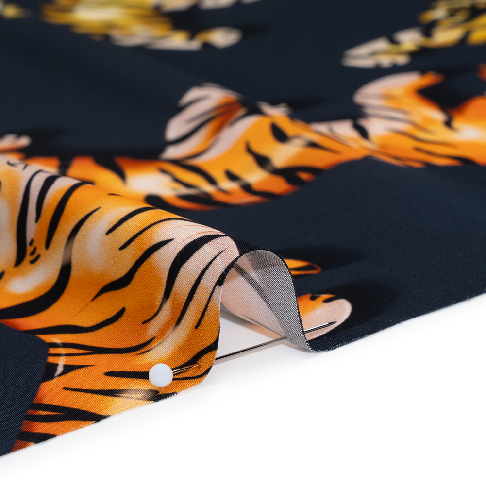 Bring the jungle party to your closet with our Mood Exclusive Pop Jungle Polyester Satin—perfect for lively dresses and standout statement pieces that move with you. Suggested Projects: Dresses, Skirts, Blouses, Linings Content: 100% Polyester Stretch: NoneOpacity: Slightly Translucent Set against a deep navy backdrop, vibrant yellow and orange balloon-like tigers frolic with a vibe that’s equal parts fun and fierce. Their inflated forms bring a quirky, dimensional energy, making this fabric an eye-catching choice for dresses, skirts, and blouses that demand attention with a playful twist. The smooth polyester satin offers a fluid drape that moves gracefully, elevating any silhouette from casual chic to statement glam. Slightly translucent, this fabric pairs best with a lining to ensure comfort and coverage while maintaining its light feel and wearable elegance.