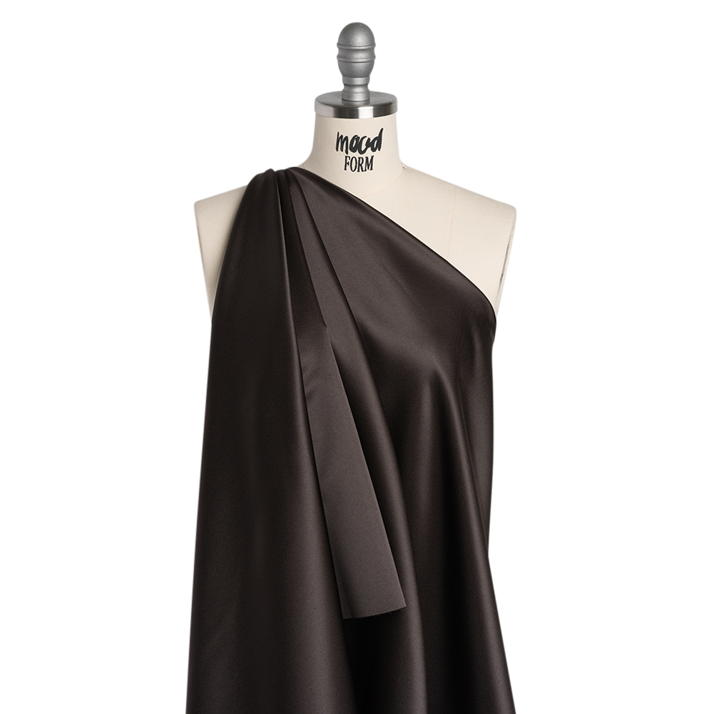 Give your designs the jolt of freshly brewed coffee with this Nu Mocha Polyester Satin. Featuring a smooth hand and fluid drape, it’s ideal for billowing evening attire.Suggested Projects: Dresses, Skirts, Blouses, LiningsContent: 100% PolyesterStretch: NoneOpacity: OpaqueFall into the indulgent embrace of this mocha brown satin. Craving the luxe look of silk satin without the stress of care and cost? Enter this glossy polyester satin collection—lightweight, silky-smooth, and effortlessly chic. Fully opaque and with no stretch, it echoes the elegance of a matte duchess satin, offering a sleek hand, radiant sheen, and fluid drape. From aisle-worthy gowns to weekday blouses, statement costumes to polished linings, this fabric brings accessible glamour to every stitch of your wardrobe. Opaque, a lining is not necessary but may be added if structure is desired.
