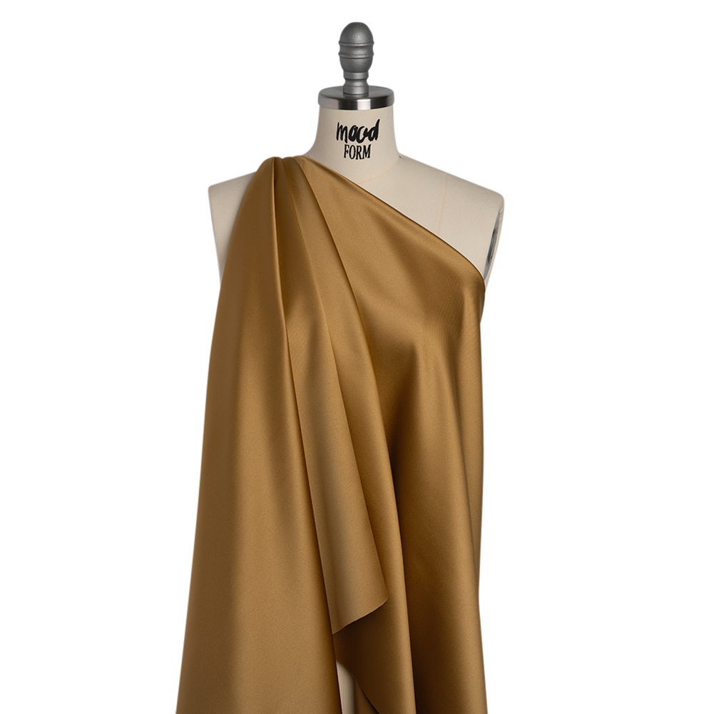 Don’t let this Plateau Gold Polyester Satin slip through your fingers. Featuring a smooth hand and fluid drape, it’s ideal for billowing evening attire.Suggested Projects: Dresses, Skirts, Blouses, LiningsContent: 100% PolyesterStretch: NoneOpacity: OpaqueTake time to luxuriate in the golden grains of this satin. Craving the luxe look of silk satin without the stress of care and cost? Enter this glossy polyester satin collection—lightweight, silky-smooth, and effortlessly chic. Fully opaque and with no stretch, it echoes the elegance of a matte duchess satin, offering a sleek hand, radiant sheen, and fluid drape. From aisle-worthy gowns to weekday blouses, statement costumes to polished linings, this fabric brings accessible glamour to every stitch of your wardrobe. Opaque, a lining is not necessary but may be added if structure is desired.