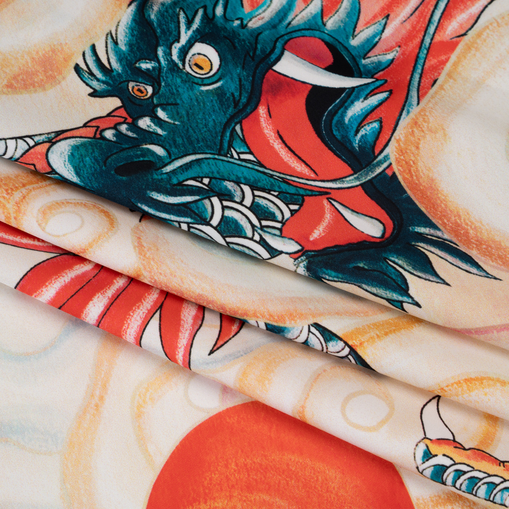 You’ll be on cloud fine with our Mood Exclusive Skybound Scales Polyester Satin! With its silky finish and graceful drape, this fabric brings bold energy and fluid motion to standout garments. Suggested Projects: Dresses, Skirts, Blouses, Linings Content: 100% Polyester Stretch: NoneOpacity: Slightly Translucent Red and blue Eastern-style dragons soar through swirling clouds of light blue, pink, and orange along with deep ombre red suns across a smooth satin surface, creating a sense of movement and majesty. The design combines dynamic color with flowing shapes to conjure a mythical atmosphere that feels both fierce and ethereal. Slightly translucent, this polyester satin offers a cool, soft hand and a subtle sheen that enhances its dramatic visuals. Its gentle drape and fluid structure make it ideal for unlined dresses, statement skirts, and airy blouses, while its bold motif infuses each project with fire and flight. A lining may be preferred for added opacity depending on the design.