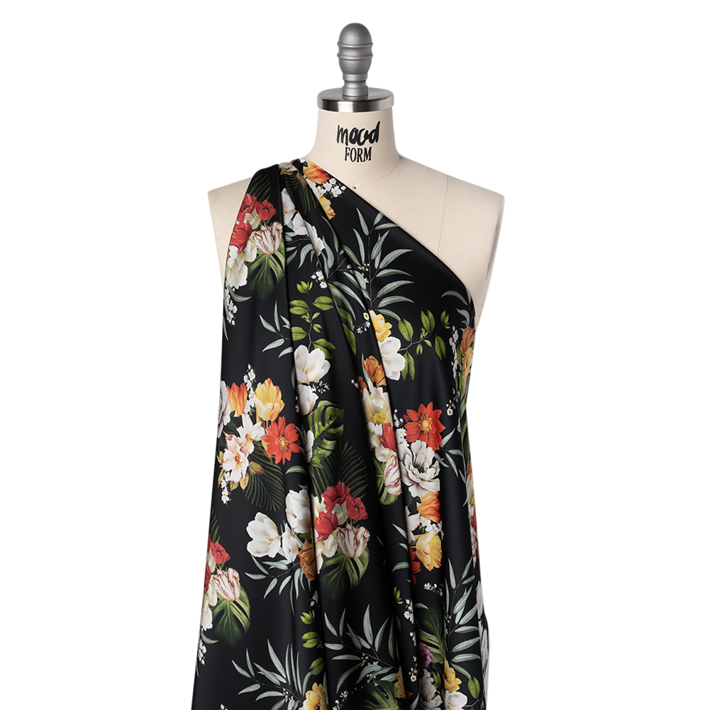 Bloom where the night shines brightest with our Mood Exclusive Midnight Bloom Polyester Satin, where lush florals and tropical leaves create a secret garden, perfect for captivating designs. Suggested Projects: Dresses, Skirts, Blouses, Linings Content: 100% Polyester Stretch: NoneOpacity: Slightly Translucent Set against a deep black backdrop, this fabric showcases vibrant blooms intertwined with leafy monstera and palm accents, evoking a moonlit jungle full of mystery and allure. The satin’s sleek, flowing drape makes it an enchanting choice for elegant dresses, breezy skirts, and delicate blouses that whisper sophistication. Airy yet substantial, it’s easy to sew and ideal for garments made to move with grace. Adding a lining will bring extra structure and enhance opacity for polished results.