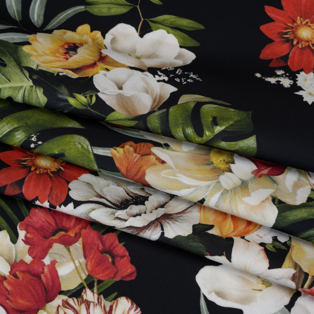 Bloom where the night shines brightest with our Mood Exclusive Midnight Bloom Polyester Satin, where lush florals and tropical leaves create a secret garden, perfect for captivating designs.
