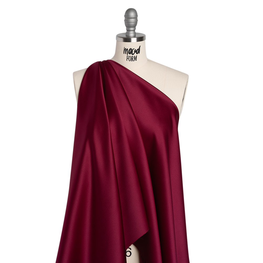 You’ll want to keep your glass full of this Ultra Burgundy Polyester Satin. Featuring a smooth hand and fluid drape, it’s ideal for billowing evening attire.Suggested Projects: Dresses, Skirts, Blouses, LiningsContent: 100% PolyesterStretch: NoneOpacity: OpaqueLike dinner accompanied with fine red wine and candlelight, this burgundy satin is an elegance worth indulging in. Craving the luxe look of silk satin without the stress of care and cost? Enter this glossy polyester satin collection—lightweight, silky-smooth, and effortlessly chic. Fully opaque and with no stretch, it echoes the elegance of a matte duchess satin, offering a sleek hand, radiant sheen, and fluid drape. From aisle-worthy gowns to weekday blouses, statement costumes to polished linings, this fabric brings accessible glamour to every stitch of your wardrobe. Opaque, a lining is not necessary but may be added if structure is desired.