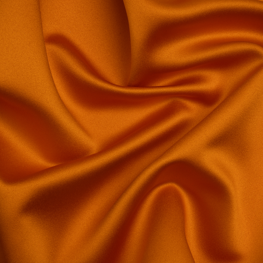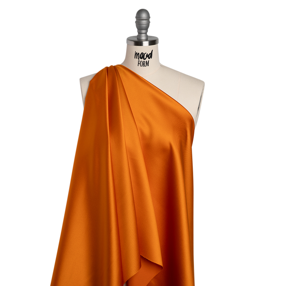 This Ultra Pumpkin Polyester Satin burns brightly with the heat of harvest. Featuring a smooth hand and fluid drape, it’s ideal for billowing evening attire.Suggested Projects: Dresses, Skirts, Blouses, LiningsContent: 100% PolyesterStretch: NoneOpacity: OpaqueCarve your dream designs out of this pumpkin orange satin. Craving the luxe look of silk satin without the stress of care and cost? Enter this glossy polyester satin collection—lightweight, silky-smooth, and effortlessly chic. Fully opaque and with no stretch, it echoes the elegance of a matte duchess satin, offering a sleek hand, radiant sheen, and fluid drape. From aisle-worthy gowns to weekday blouses, statement costumes to polished linings, this fabric brings accessible glamour to every stitch of your wardrobe. Opaque, a lining is not necessary but may be added if structure is desired.