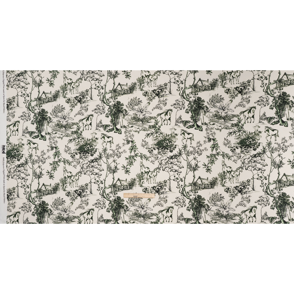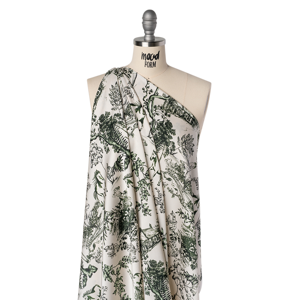 Rein in rustic romance with our Mood Exclusive Bridle and Branch Polyester Satin–perfect for breezy daywear and fairytale looks alike.Suggested Projects: Dresses, Skirts, Blouses, Linings Content: 100&#37 Polyester Stretch: NoneOpacity: Slightly Translucent Covered in deep green hand-drawn scenes of leafy trees, delicate florals, windswept horses, and quaint cottages across an ivory ground, this print captures the whimsical serenity of a countryside stroll. The illustrations appear lightly sketched with a storybook flair, giving the fabric a charming, nostalgic quality. Smooth to the touch with graceful movement, this slightly translucent polyester satin flows effortlessly into tiered prairie dresses, ruffled skirts, wrap blouses, and gathered peasant tops. With no stretch and a soft hand, it’s also an elegant choice for romantic linings and lightweight layering. Add a lining for extra coverage where needed.