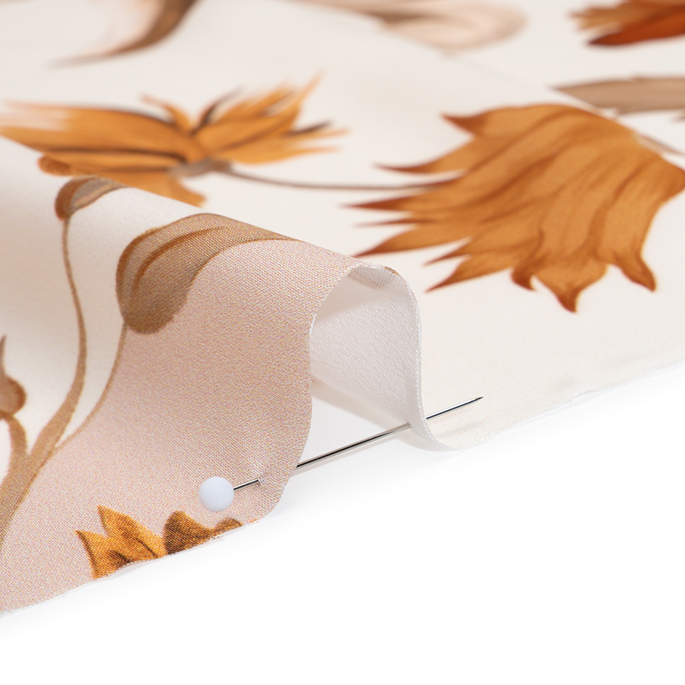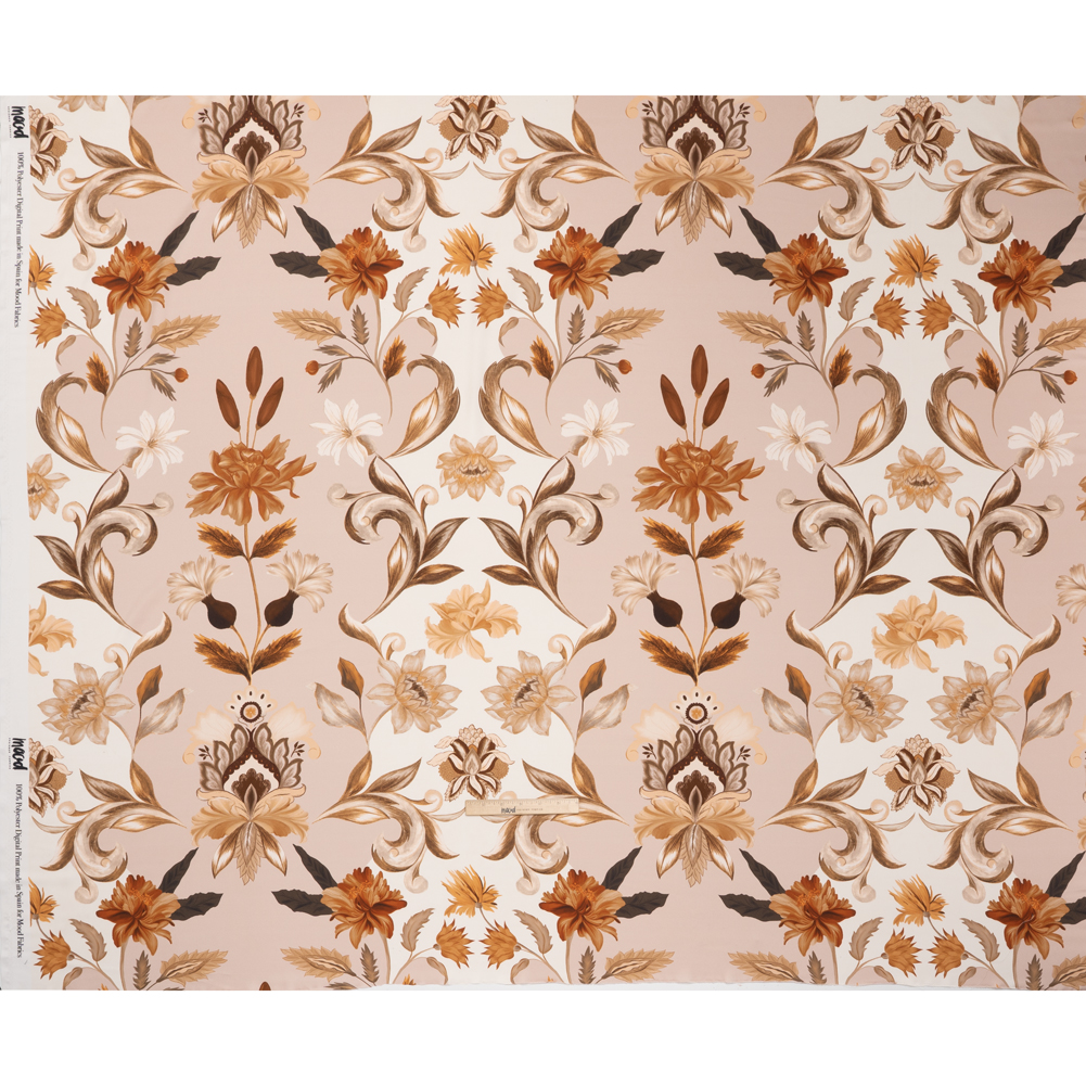 Add a touch of rococo and roll with our Mood Exclusive Fleur de Rocaille Polyester Satin–just the right thing for ornate skirts, airy blouses, or subtly elegant linings. Suggested Projects: Dresses, Skirts, Blouses, Linings Content: 100% Polyester Stretch: NoneOpacity: Slightly Translucent Beige florals with deep orange and cocoa-brown shading scatter across the face, framed by scrolling Rocaille motifs that give the print a classical, architectural flourish. The framing effect, more pronounced against the white outer sections, enhances the sense of symmetry and sophistication. Slightly translucent with a cool, smooth surface and flowing drape, this polyester satin is suited to graceful silhouettes and soft layering. Whether you’re crafting statement garments or lining more tailored pieces, it offers a refined yet painterly touch. You may want to add a lining for full opacity depending on your project.