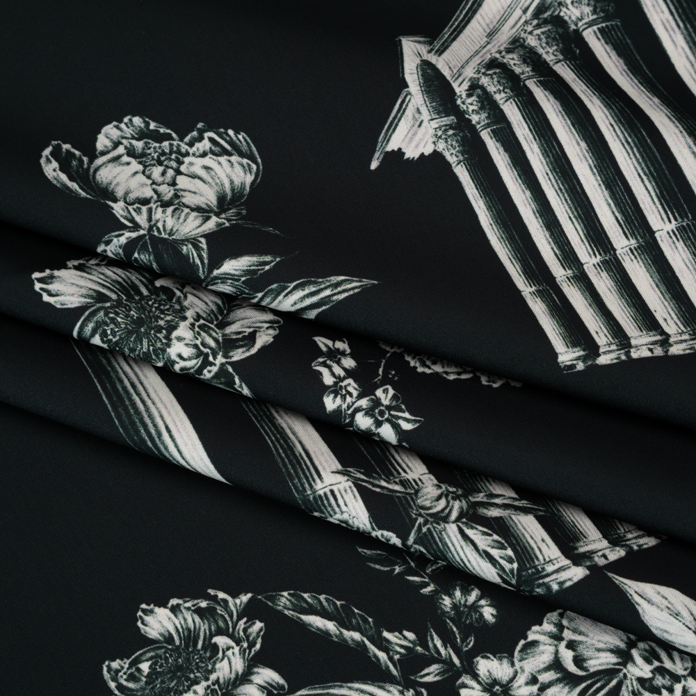 Polyester Satin - White on Black Flowers and Columns - Mood Exclusive Petal Pillars Print