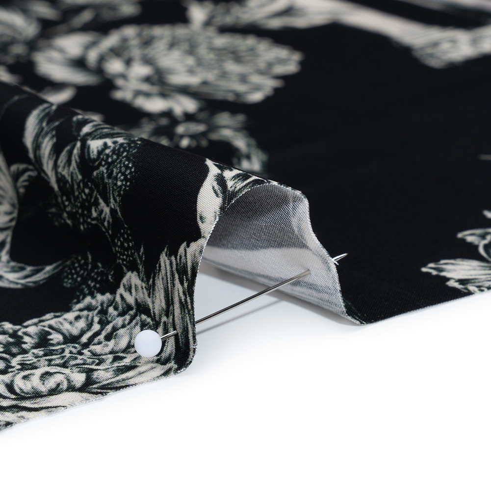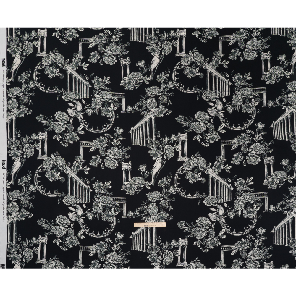Take your next design to new heights with our Mood Exclusive Petal Pillars Polyester Satin, where stately pillars and perched songbirds set a striking scene for bold silhouettes. Suggested Projects: Dresses, Skirts, Blouses, Linings Content: 100% Polyester Stretch: NoneOpacity: Slightly Translucent Detailed in a refined, hand-drawn style, this elegant print features white architectural pillars entwined with blooming branches and birds resting on slender limbs across a black ground. The slightly translucent polyester satin has a cool, sleek surface and a supple, flowing drape ideal for soft column dresses, gathered peasant blouses, high-low skirts, and fluid linings. With no stretch and a silky finish, it delivers ease of movement and refined structure in equal measure. A lining may be used when more coverage is needed.