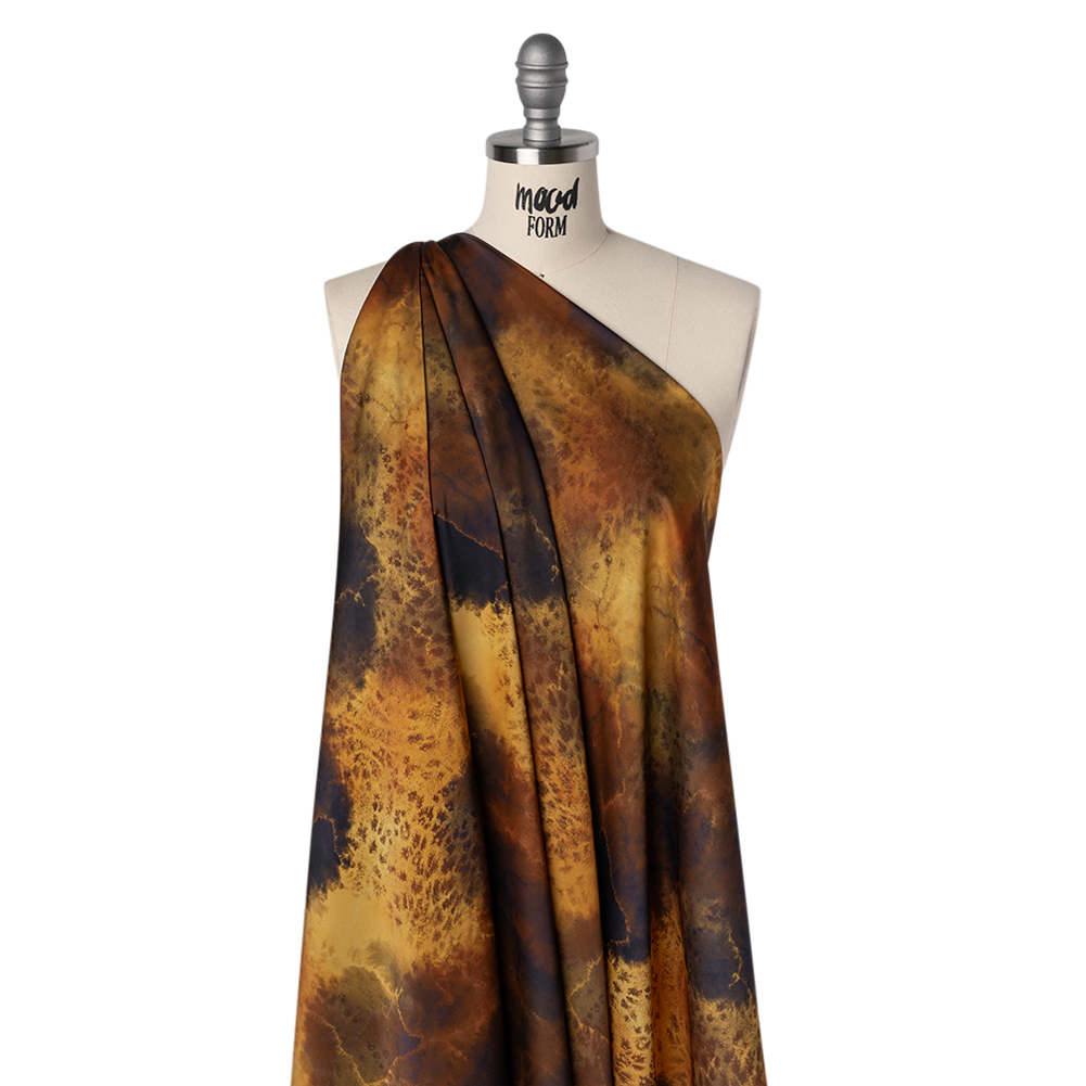 Brighten up your fashion forecast with our Mood Exclusive Nebula Storm Polyester Satin—a radiant choice for statement skirts, celestial dresses, or soft, swirled linings.Suggested Projects: Dresses, Skirts, Blouses, Linings Content: 100&#37 Polyester Stretch: NoneOpacity: Slightly Translucent Swirling waves of color streak across the surface like gaseous storms in deep space, with cloudy layers of saturated black and russet tones blending into a base of golden yellow. A soft, spotted effect drifts through certain areas, adding extra dimension and an ethereal, misty quality to the print. This fabric boasts a silky surface and fluid drape that brings movement to every pattern. Slightly translucent with no stretch, it lends itself beautifully to flowing silhouettes and light layering. Whether you're dreaming up a galaxy-inspired dress or adding a dreamy lining, this satin gives your project a cosmic edge. You may wish to add a lining depending on opacity needs.