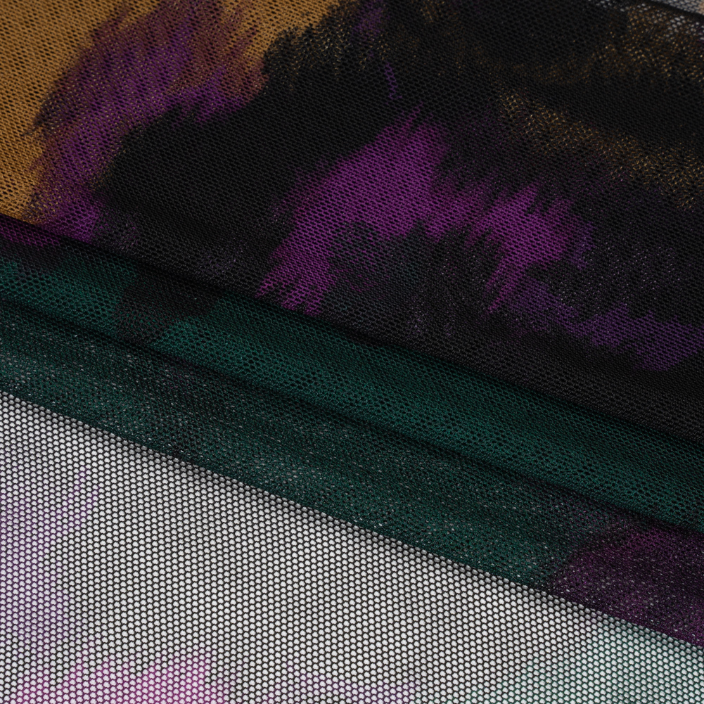Polyester Stretch Mesh – Dark Green, Purple and Gold Ikat Floral – Designer Deadstock