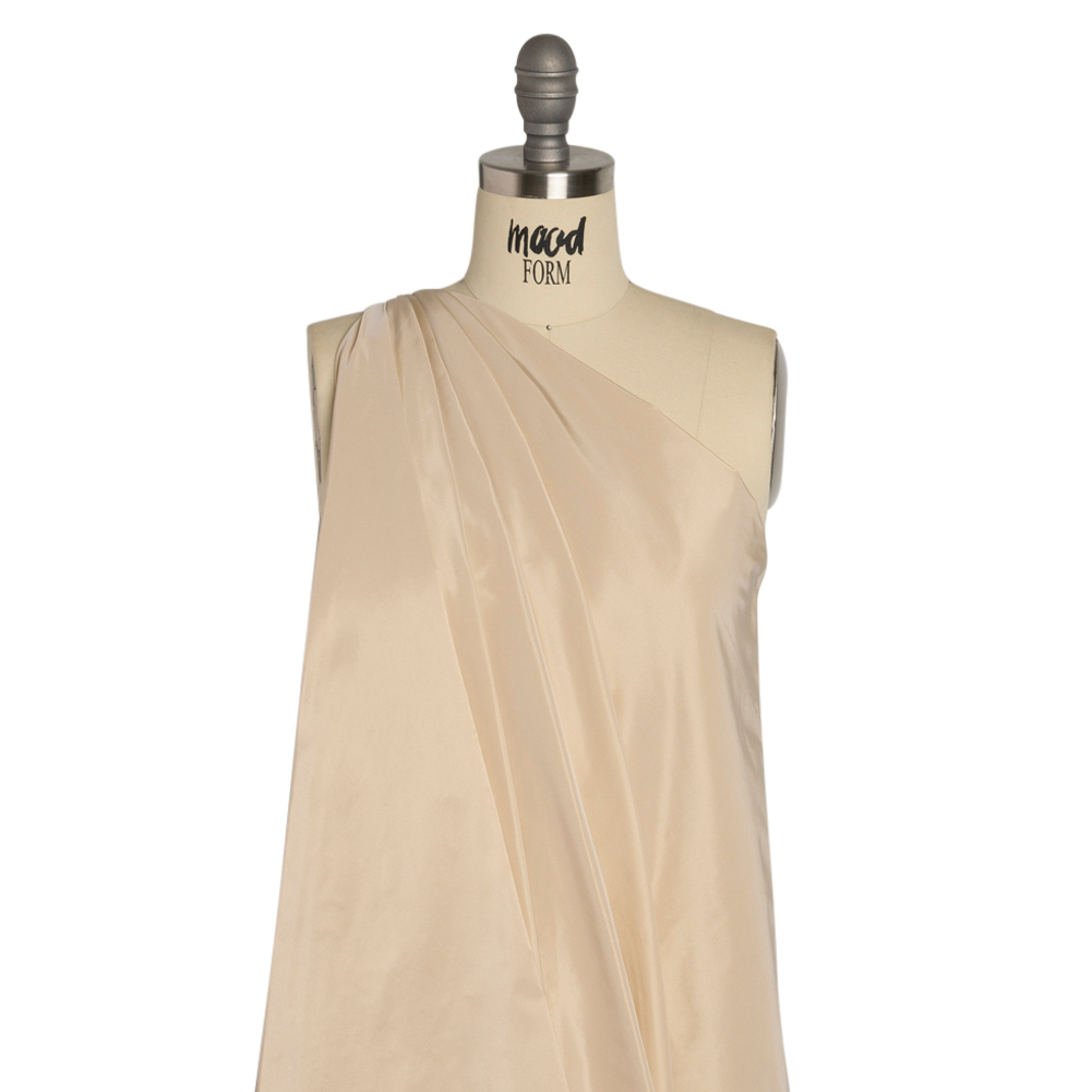 As neutrals rule the runway, embrace timeless shades with this Beige Polyester Taffeta, featuring a smooth hand and crisp drape.Suggested Projects: Dresses, Skirts, Jackets, JumpsuitsContent: 100% PolyesterStretch: NoneOpacity: Slightly TranslucentA light beige shade delights, all on a smooth, luminous polyester taffeta. Crisp and structural in drape, craft architectural evening gowns, voluminous skirts, sleek jumpsuits, and all manner of gorgeous evening wear. Somewhat translucent, a lining may be added for additional structure and opacity, but isn't always necessary.