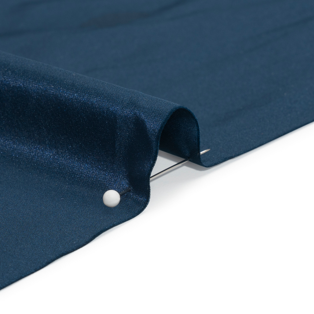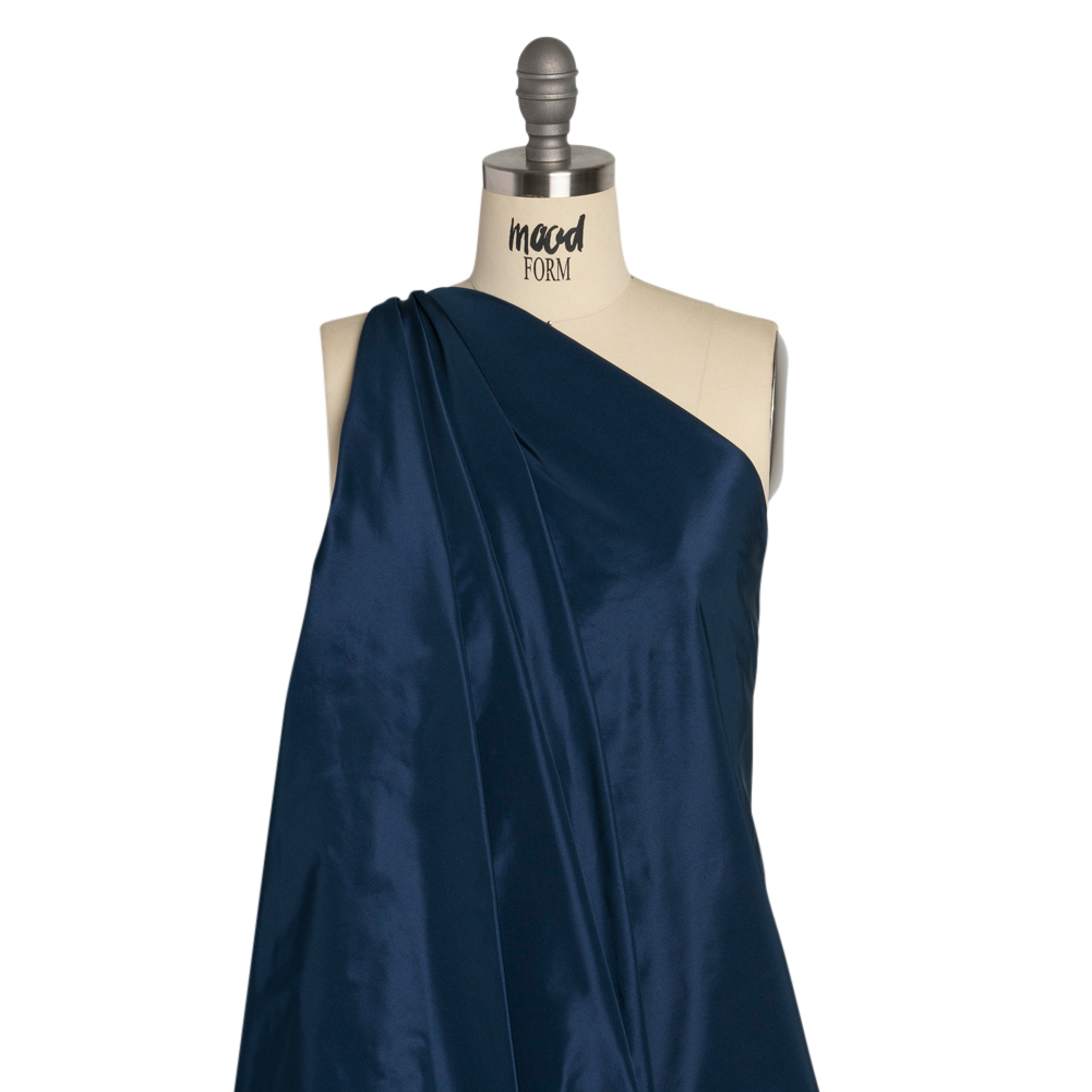 Create dignified and stately eveningwear with this Navy Polyester Taffeta, featuring a smooth hand and crisp drape.Suggested Projects: Dresses, Skirts, Jackets, JumpsuitsContent: 100% PolyesterStretch: NoneOpacity: Slightly TranslucentA navy blue shade delights, all on a smooth, luminous polyester taffeta. Crisp and structural in drape, craft architectural evening gowns, voluminous skirts, sleek jumpsuits, and all manner of gorgeous evening wear. Somewhat translucent, a lining may be added for additional structure and opacity, but isn't always necessary.