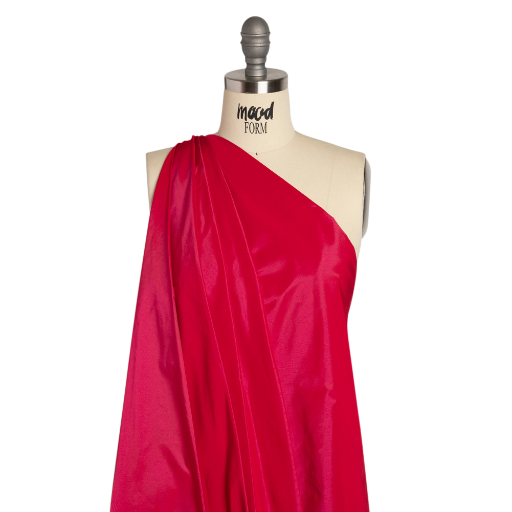 Have your pick of gorgeous garments with this Raspberry Polyester Taffeta, featuring a smooth hand and crisp drape.Suggested Projects: Dresses, Skirts, Jackets, JumpsuitsContent: 100% PolyesterStretch: NoneOpacity: Slightly TranslucentA bright raspberry shade delights, all on a smooth, luminous polyester taffeta. Crisp and structural in drape, craft architectural evening gowns, voluminous skirts, sleek jumpsuits, and all manner of gorgeous evening wear. Somewhat translucent, a lining may be added for additional structure and opacity, but isn't always necessary.