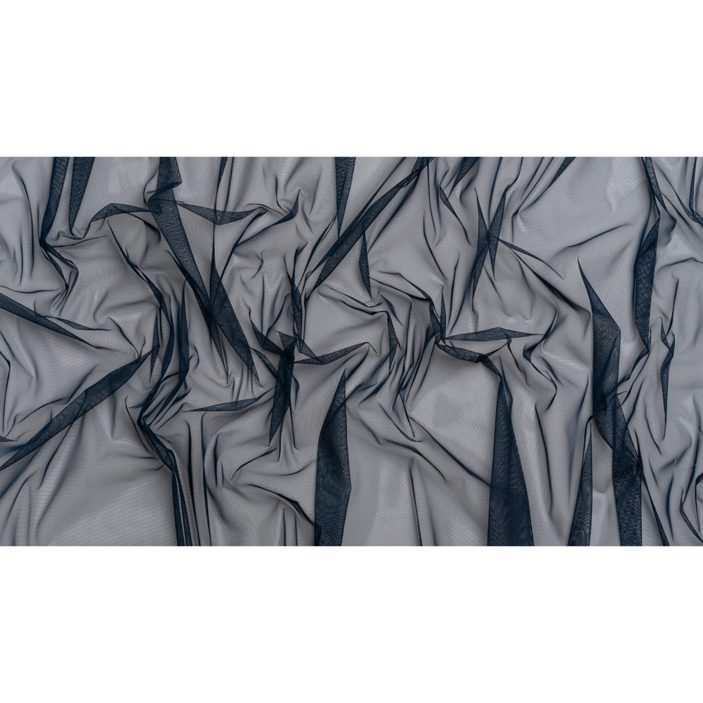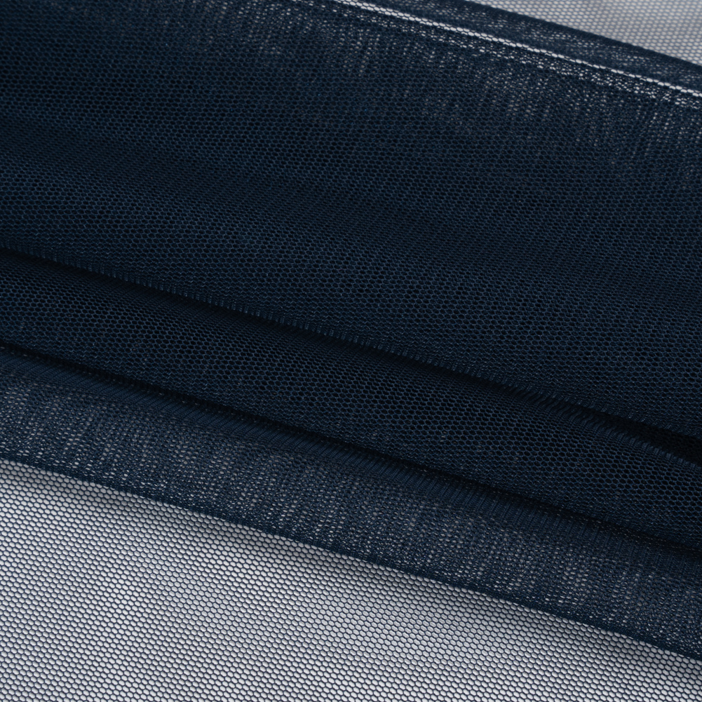 Enter the Marine Ball with a dress to match the occasion, finished with this Navy Polyester Tulle, featuring a grainy, dry hand and a voluminous drape.Suggested Projects: Skirts, Dresses, Tutus, Shirt SleevesContent: PolyesterStretch: 50% WeftwiseOpacity: SheerDance all night in this navy tulle. Add volume, flair, or elaborate design details to any garment or accessory using this phenomenal polyester tulle! For those who are unfamiliar with tulle fabric in general, it is a fine, often starched, net fabric used for tutus, veils, dresses, trims, etc. This one specifically has a dry, grainy hand and voluminous drape that lends itself well to underlays for skirts, gowns and dresses—or take advantage of its moderate stretch through the weft and create poofy sleeves and high-fashion designs. Sheer, we suggest use with a lining, layering, or as an underlay.