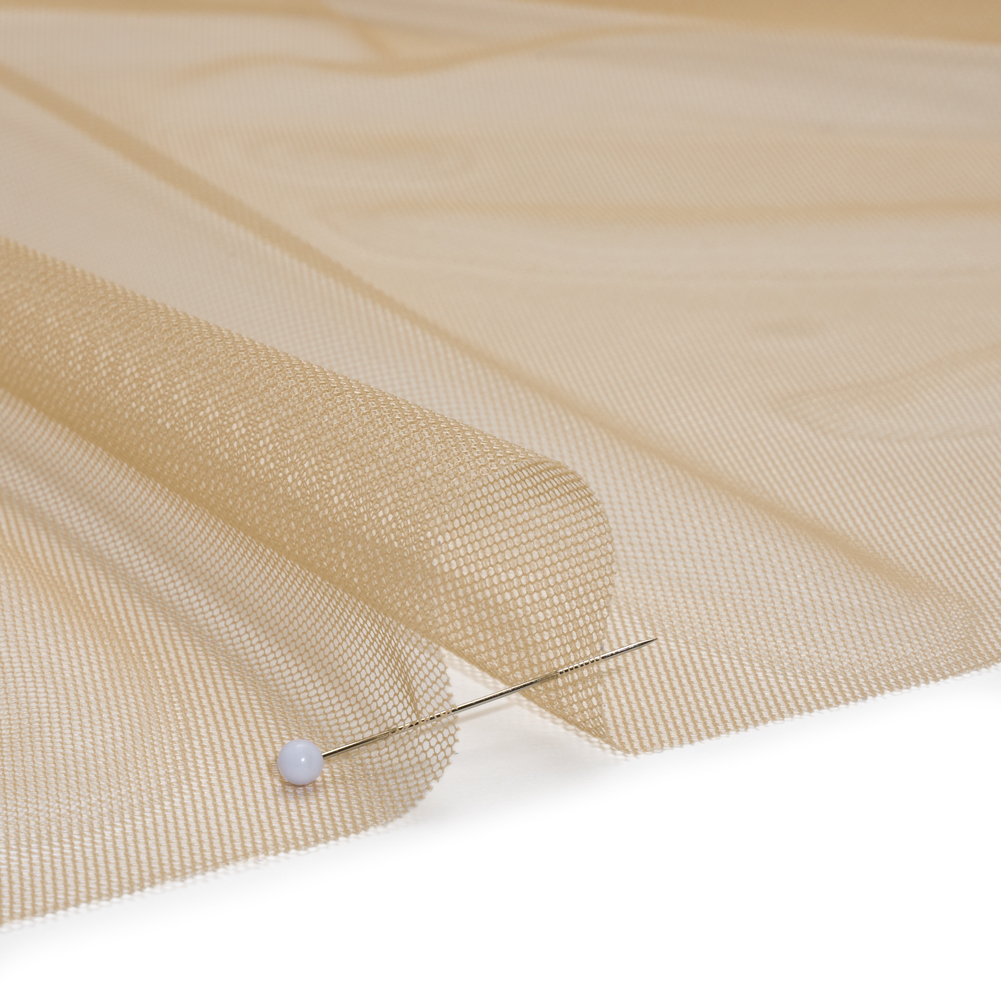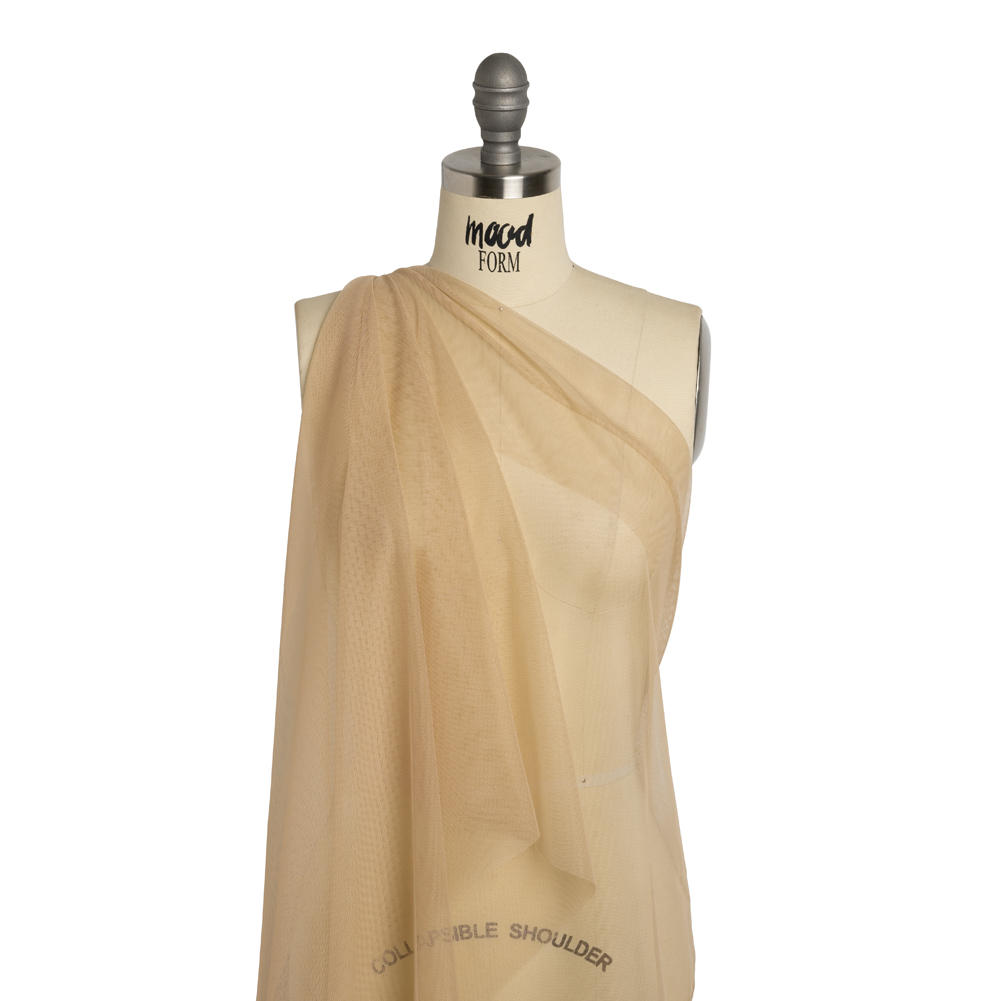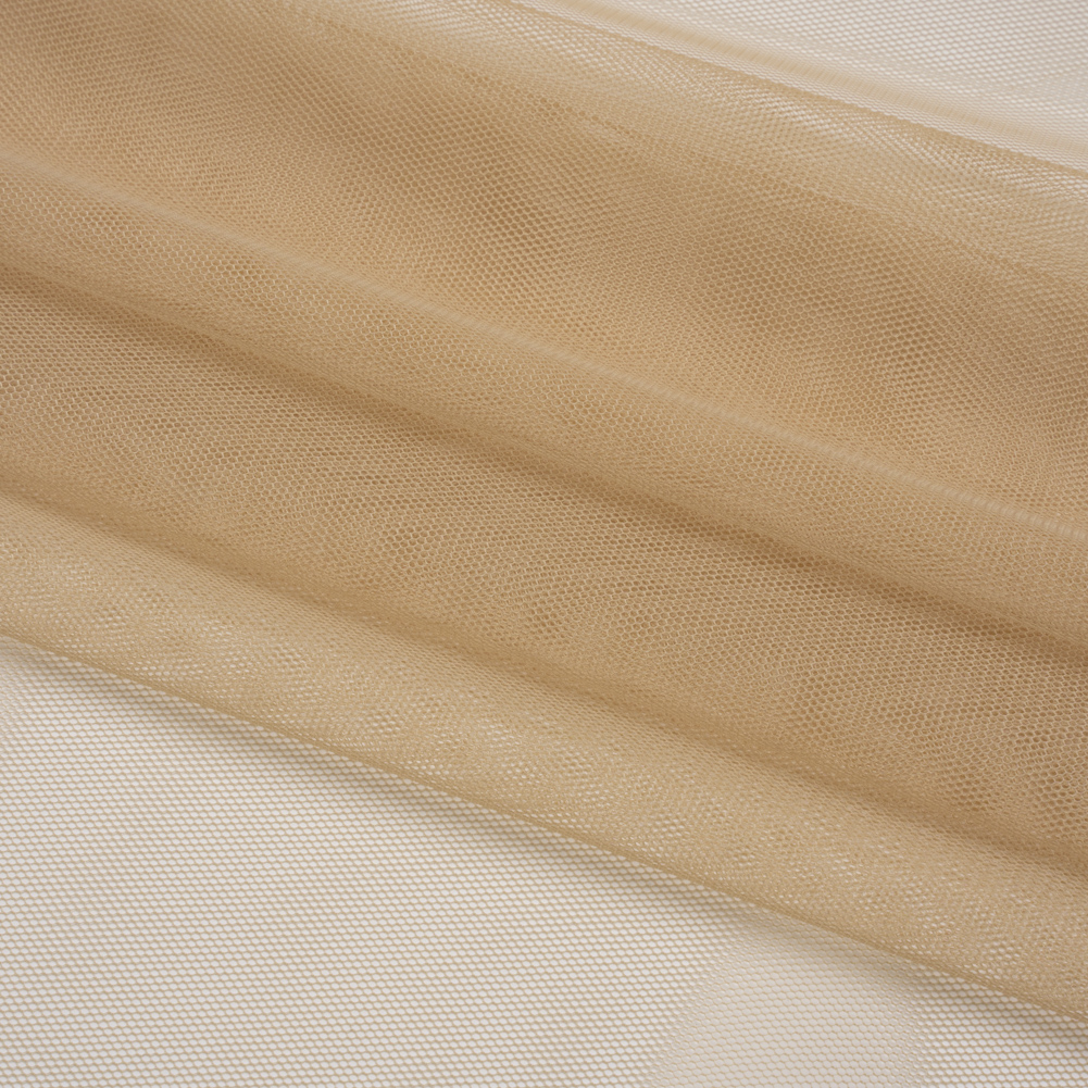 Luxury comes naturally to this Sand Polyester Tulle, featuring a grainy, dry hand and a voluminous drape.Suggested Projects: Skirts, Dresses, Tutus, Shirt SleevesContent: PolyesterStretch: 50% WeftwiseOpacity: SheerBare your ideas with this beige tulle. Add volume, flair, or elaborate design details to any garment or accessory using this phenomenal polyester tulle! For those who are unfamiliar with tulle fabric in general, it is a fine, often starched, net fabric used for tutus, veils, dresses, trims, etc. This one specifically has a dry, grainy hand and voluminous drape that lends itself well to underlays for skirts, gowns and dresses—or take advantage of its moderate stretch through the weft and create poofy sleeves and high-fashion designs. Sheer, we suggest use with a lining, layering, or as an underlay.