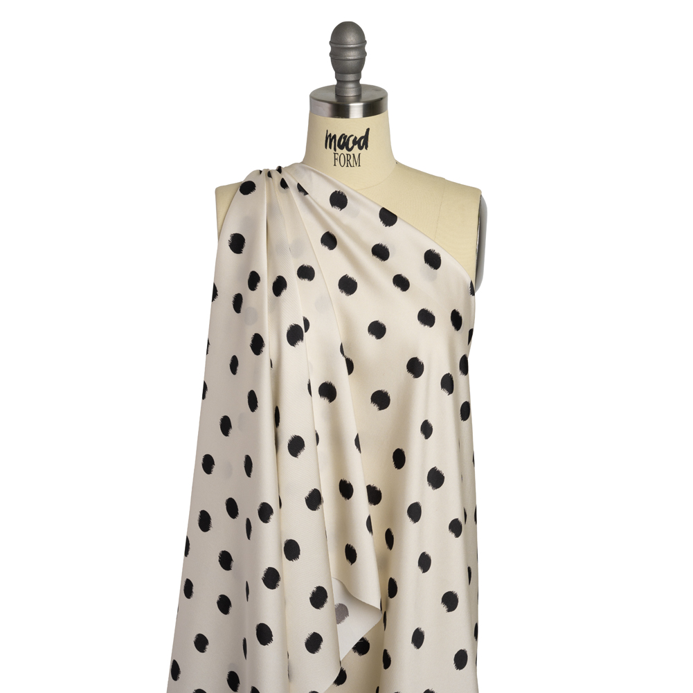 This Brushed Polka Dots Polyester Twill is sure to hit the spot. Featuring a smooth, soft hand and flexible drape.Suggested Projects: Dresses, Skirts, Shirts, LiningsContent: PolyesterStretch: NoneOpacity: Slightly TranslucentBlack polka dots scatter across an ivory background, brushed to create imperfections within the dots themselves. Featuring the distinctive diagonal pattern of a twill weave and a lovely subtle sheen, its hand is extremely soft and smooth with a slight crispness. With a flexible drape, create light skirts and dresses with a plethora of movement, or use it as a lining for other materials! Somewhat translucent, consider adding a lining when using this twill as the main fabric, both for opacity and to add structure where needed.