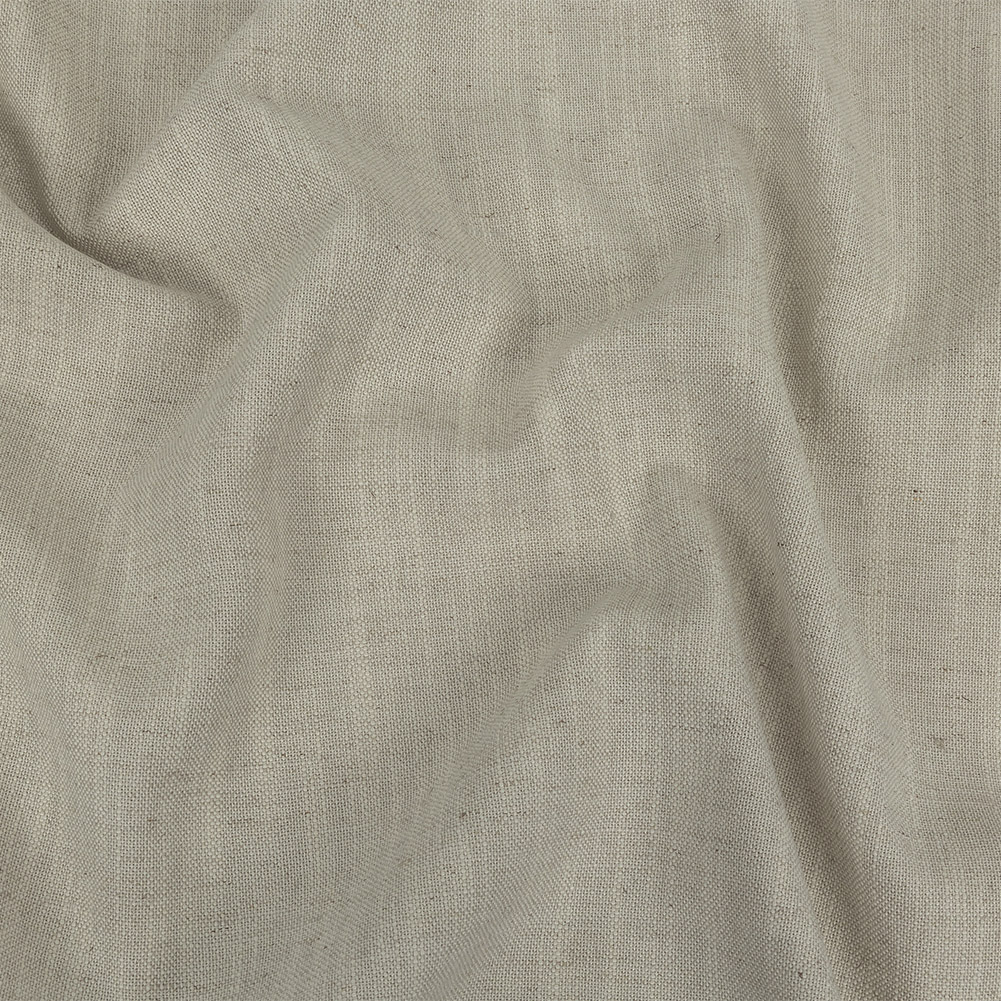 Boasting a non-traditional ivory coloration, this British Imported Ivory Polyester, Viscose and Linen Woven features an almost striated appearance of off-white, silver, and gray strands! Boasting a visible plain-weave structure, this light silvery beige woven with slight variations in hue promises a soft, tactile hand with a slubbed texture typical of linen, as well as a malleable drape. Ideal for all your home decor needs, fashion pleated drapes and curtains, cover couches and ottomans, or create eye-catching throw pillows! Due to its slightly open weave, this medium-weight fabric allows some light through, so consider adding a lining for complete opacity or additional structure. Please note that because of the way that the selvage is woven, only 55 inches of the total 57-inch width are usable.
