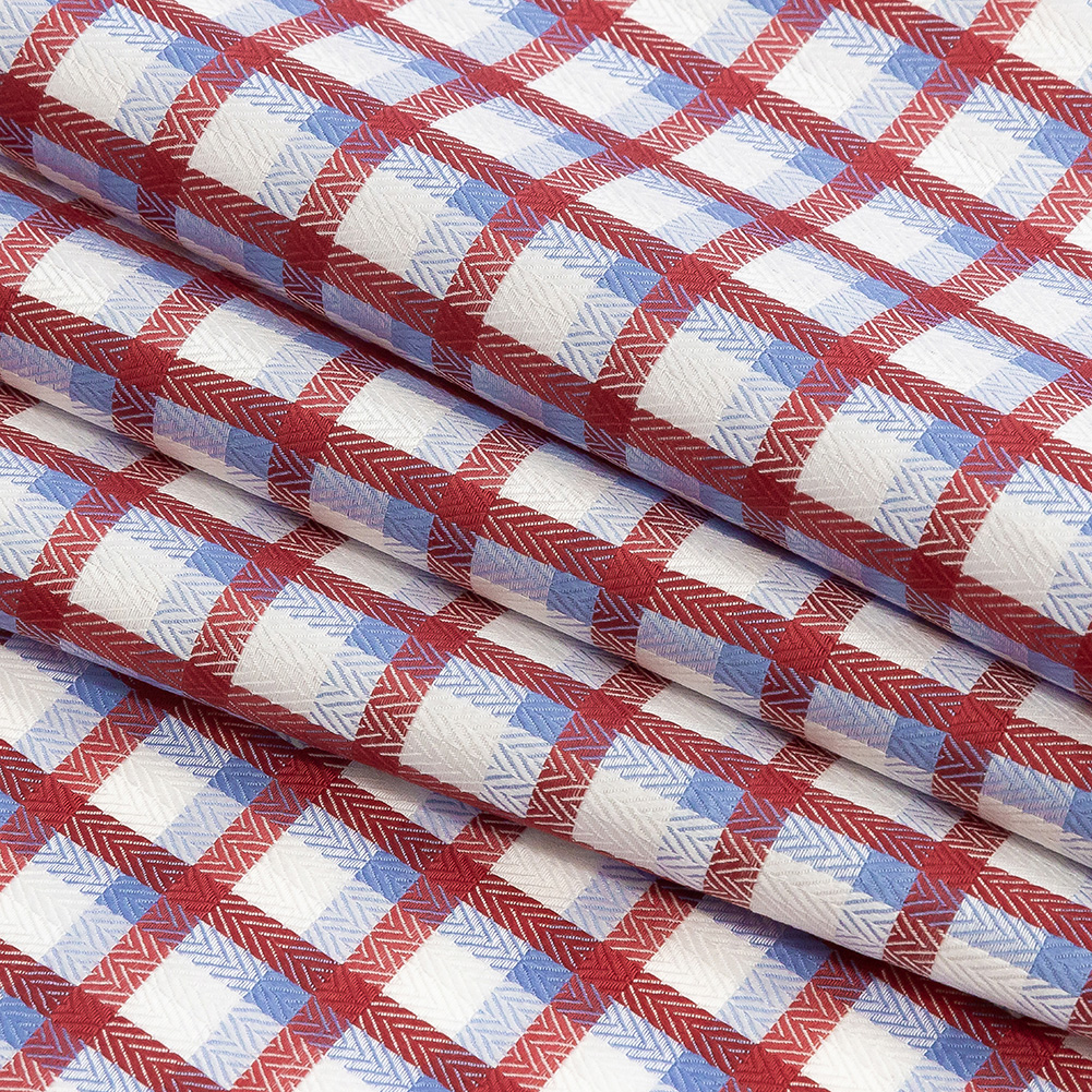 Silhouetted lines saturate the face of this beautiful Premium Light Blue and Rococco Red Shadow Check and Chevron Cotton Dobby Shirting.