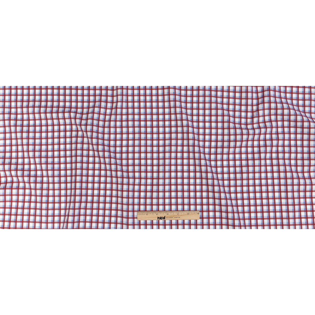 Silhouetted lines saturate the face of this beautiful Premium Light Blue and Rococco Red Shadow Check and Chevron Cotton Dobby Shirting. Soft and smooth in hand, its primary red checkered design is shadowed by faded blue lines and decorated by a chevron patterning that nicely complements its slightly lustrous finish. Lightweight and without stretch, its single-ply composition boasts a thread count of 60-70, which makes this the perfect material for a multitude of shirting applications. Create simple button-up shirts and blouses for the work week, or go for something more sophisticated like billowing shirt dresses with angel sleeves that accentuate its relaxed, flexible drape. Slightly translucent, a lining may be desired for true opacity depending on its application.