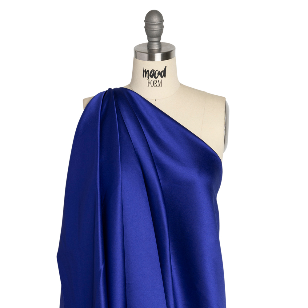 Create opulent designs with this Mazarine Blue Premium Polyester Satin. Featuring a medium weight, sleek hand, and fluid drape, it’s the perfect choice for eye-catching evening wear.Suggested Projects: Dresses, Skirts, Blouses, ShirtsContent: 100% PolyesterStretch: NoneOpacity: OpaqueTaking its name from the Mazarine Blue butterfly, this satin will help your creativity take flight. A sleek hand, lustrous face, and fluid drape combine to deliver affordable elegance to your wardrobe. This medium-weight, royal blue fabric enjoys a simple sophistication, perfect for special occasions, costumes, workdays, and everything in between. With or without a lining, create long gowns, short cowl-neck dresses, elegant blouses, comfortable jacket linings, and more.Pair premium quality with affordability in our Exclusive Basics Collections! Explore colorful polyester satin and more, perfect for creating special occasion looks on a budget.