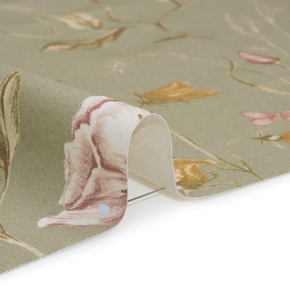 This Sage Flowering Stems and Butterflies Printed Cotton Canvas is a never-ending map of botanical beauty—featuring a smooth, lightly tactile hand and semi-structured drape.Suggested Projects: Curtains, Throw Pillows, Headboards, JacketsContent: 100% CottonStretch: NoneOpacity: Slightly TranslucentA budding botanist’s keen eye delicately sketches flowers, butterflies, and greenery in soft hues of yellow ochre, dusty rose, sage green, and brown, all flourishing against a serene sage green canvas. The artist in you is drawn to canvas—a fabric that sways between rustic and refined, offering itself easily to living rooms, kitchens, bedrooms, and even wardrobes. With a smooth, lightly tactile hand and semi-structured drape, it’s ideal for drapery and light upholstery projects like headboards, throw pillows, and curtains, or go the fashion route with structured jackets and tote bags! Slightly translucent, a lining will increase opacity and structure.