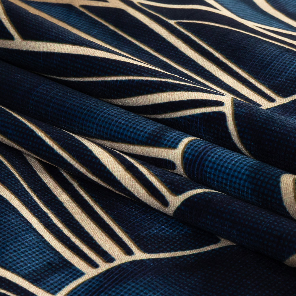 Make your home the gem of the neighborhood with this British Imported Sapphire Labyrinth of Arches Printed Microvelvet! Intersecting pale gold arches form a pattern radiating with Art-Deco brilliance, all over a rich navy blue ground. Plush with a short pile, this velvet is pliable in drape and ideal for both drapery and upholstery applications. Craft chic throw pillows, refurbish vintage stools and ottomans, or create statement valances. Opaque, a backing may be added for additional structure but isn't fully necessary.Please note: While this fabric is 57 inches wide, only 55 inches shows the pattern, with one inch on either selvedge edge left white. Due to the nap, cut all pattern pieces in one direction to maintain consistency of color and texture.